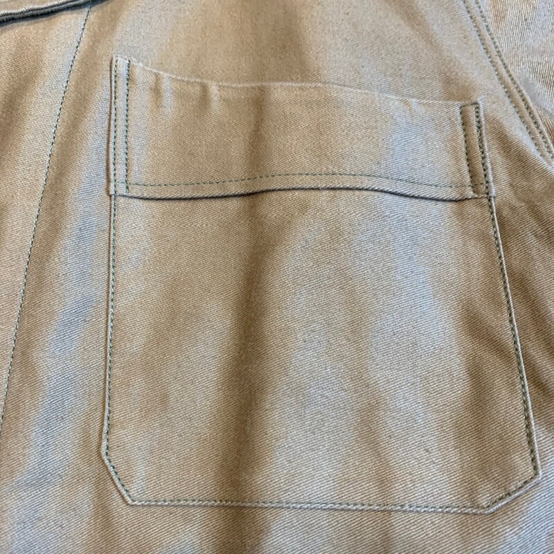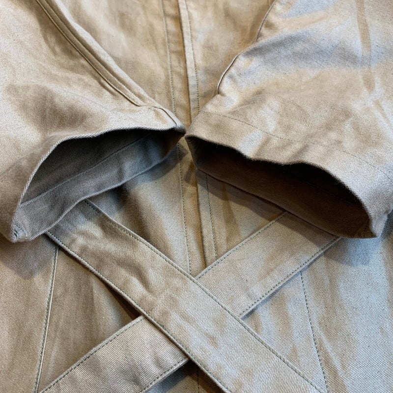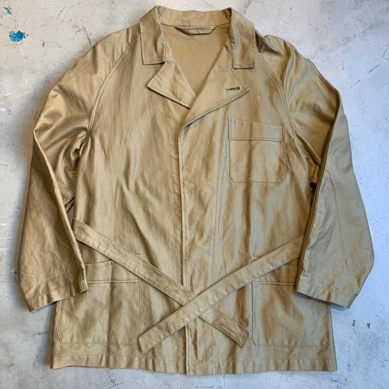 50年代頃のイタリア軍ホスピタルジャケットです。60年代頃のオレンジがかった明るめのブラウンカラータイプの物より古いモデルだと思われますが詳細は不明です。目の詰まったコットンモールスキン地で、フロントは1つボタン仕様です。ウエストのベルトでガウンのように前を閉めるタイプです。70年代以降に作られたフランネルタイプとデザインはほぼ同じですが、ベルトの取り付け方やポケットが若干違うディティールとなっています。多少の毛羽立ちはございますが、汚れやダメージは無いグッドコンディションです。着た時のシルエットがとても綺麗なジャケットです。幅広いスタイリングでお使いいただけます。このモールスキンタイプはあまり出ないと思われますので、お好きな方は是非いかがでしょうか。サイズは40位。袖がやや短めなので、袖元のレイヤードで遊んでみてください。