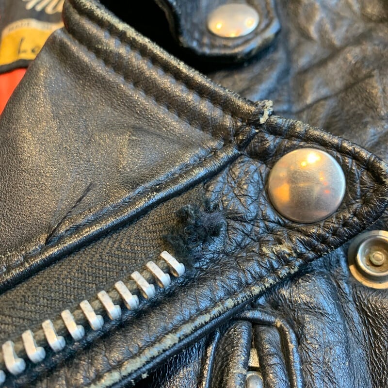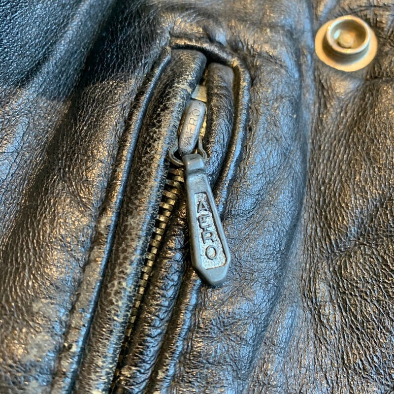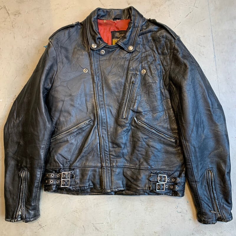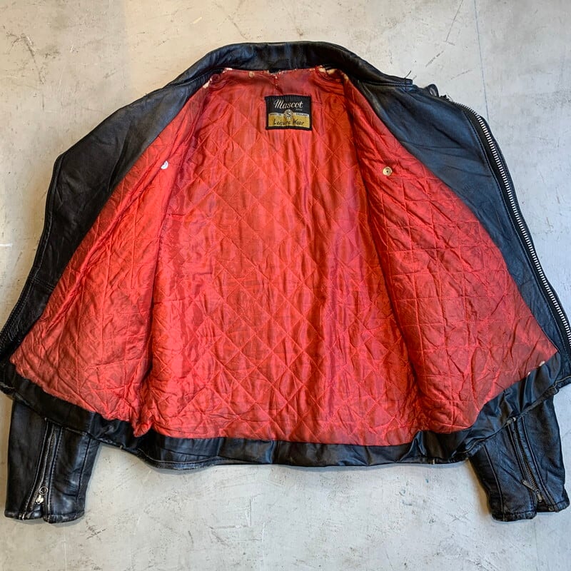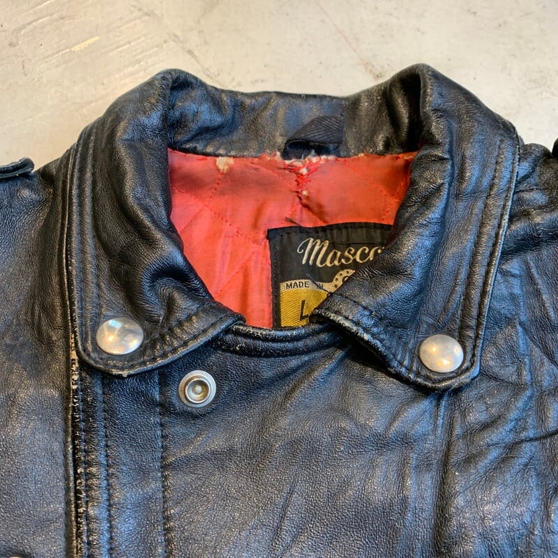 60年代のMascotレザーダブルライダースジャケットです。Black Nightというモデルのオリジナルです。ロッカーズ、パンクスやカフェレーサーに人気を博したイギリスを代表するブランドです。当時ルイスレザー等に比べ安価で手にれることが出来たことから若者に絶大な支持をされたという話もあります。実際The Clash等の有名アーティストも着用しており、人気の高さが伺えます。当時者ではスタッズ等のカスタムがメジャーだった為今回ご紹介するこちらのようにプレーンなものは希少性も高いと思われます。ブラックナイトはフロントのジッパーが比翼のように前から隠れる仕様で、背面のバックヨークも特徴的です。全体に擦れや、使用感はございますが、大きなダメージは無くレザーの質感はラムレザーのような柔らかさを保っています。ジッパーエンドの片方が取れて欠損していますが、開閉の際に問題はございません。左肩にワッペンが取り付けられていた跡がございます。ライニング首元に生地の破れが見られます。右の袖口のジッパーの取っ手が換えられています。サイズは38~40位。着こまれて良い雰囲気を醸し出しています。パンクカルチャーやkふぇれーさースタイルがお好きな方は是非この機会に手に取ってみてはいかがでしょうか。まさにコレクタブルなジャケットです。