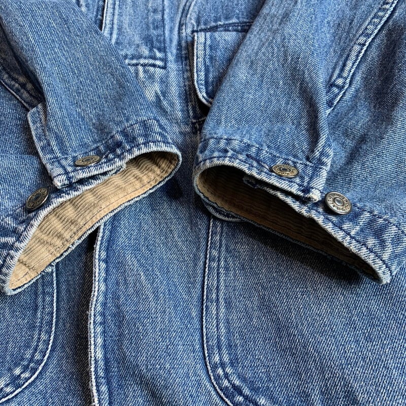 80年代から90年代頃のPolo RALPH LAUREN デニムハンティングジャケットです。白タグが付くこちらは、ダックやオイルドクロスに比べカジュアルな印象のデニムを使用した1着です。フロントはポケットが5個、カートリッジホルダーに見立てた小さなポケットが6個、背面に大きなゲームポケットがございます。肩回りにはアクションプリーツがございますので、動きやすさも兼ね備えています。色残りは4割程度。使用感は見られますが、ダメージ等はございません。サイズはXLと大き目です。昨今人気の太畝ポロコーズのパンツと合わせてみてはいかがでしょうか。希少なUSA製です。