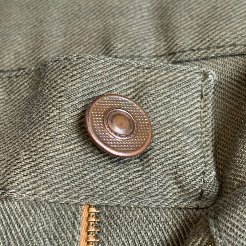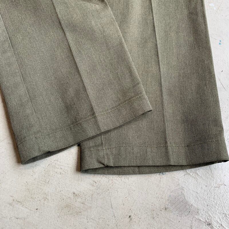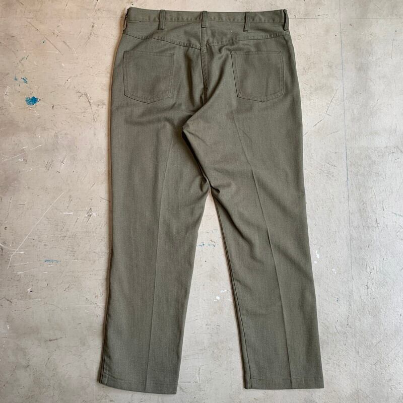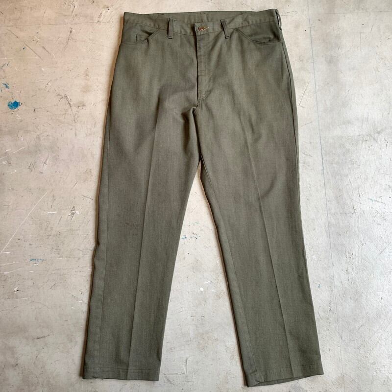 60年代から70年代頃のUNKONWNテーパード5Pパンツです。タグが無い為詳細は不明ですが、恐らくコットンポリの混紡生地です。フロントは42TALON、ボタン裏は刻印Sです。同じボタンでJCPennyのデニムを拝見した事があるので、こちらもストア系ブランドの物かもしれません。落ち着いたカーキカラーで、綺麗なテーパードシルエットが特徴的です。センタープレスの跡があり、ストレートのスタプレの様なモデルです。この年代辺りでコットンポリのパンツを探すとやはりブーツカット等のフレアタイプが多くストレートは比較的出にくく希少な1本です。右膝付近にシミが見られます。ウエストはW36位とややゆったりとしたサイズです。シルエットが非常に良いのでサイズでお探しだった方は是非いかがでしょうか。