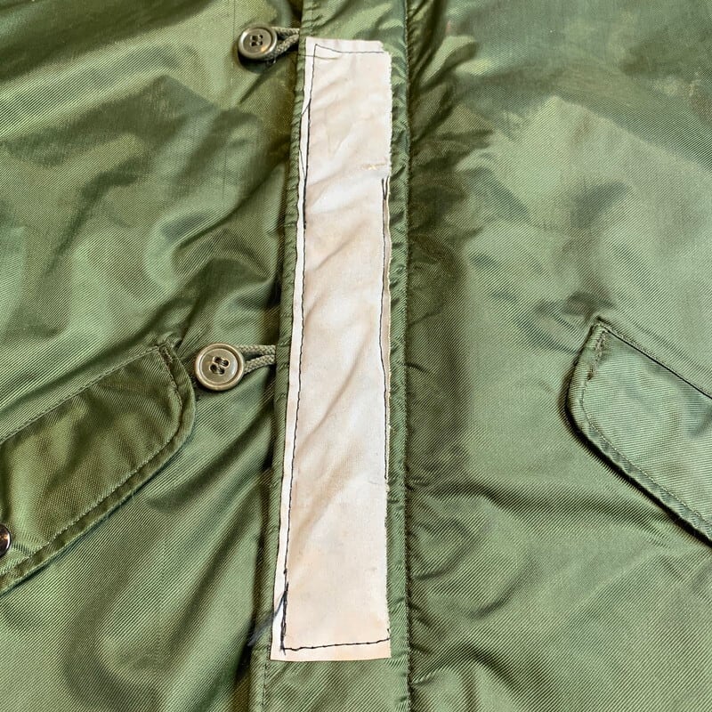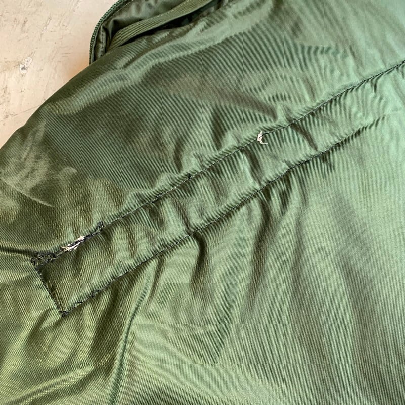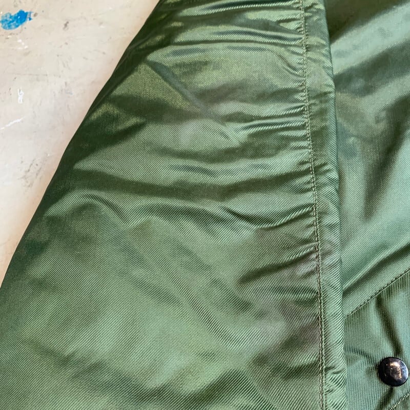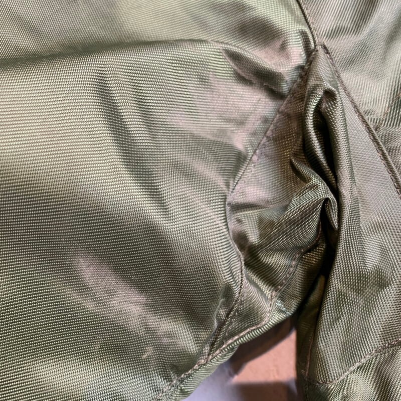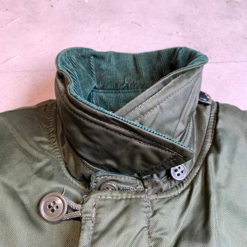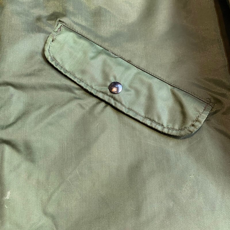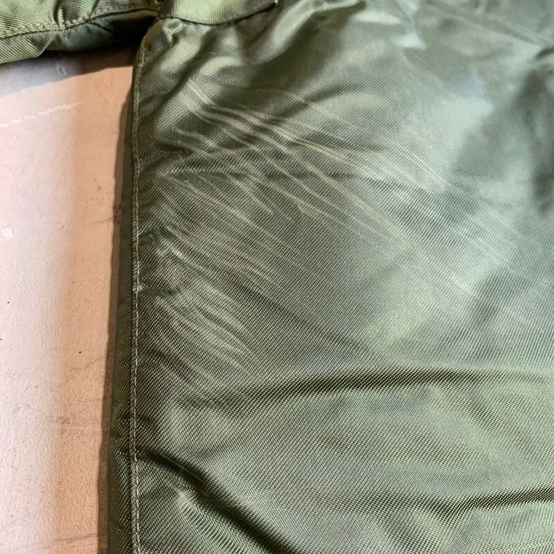 70年代のU.S.NAVY EXコールドウェザーナイロンデッキジャケットです。DLA100-78-C-0989。コントラクターはALPHA社が請け負っています。ジッパーはSCOVILLのデカブラスジッパーが使われています。A-1やA-2等と同様に甲板での作業用に使用されていたこちらは風を通しにくいナイロンが使用され、シェルの内側にはウェットスーツのようなフローティング素材が採用されたことにより、防寒防風効果はもちろんですが、万が一海に投げ出された場合も浮力がある為沈みにくい為危険なデッキ上でのリスクが軽減される仕様となっています。袖とフロント前立てにリフレクターが付きますが、左袖の1枚と背面の1枚は取り除かれています。袖や背面に擦れやシミ等ございますが、大きなダメージはございません。ジッパーをはめるときに少し入れにくいですが、はまればスムーズに開閉できます。フロントのリフレクターのステッチが一部飛んでいます。サイズはLARGEです。これからの寒くなる冬にお勧めなアウターです。こちらのナイロンデッキジャケットも市場で目にする機会も少なくなってるように感じますので、お探しだった方はいかがでしょうか。