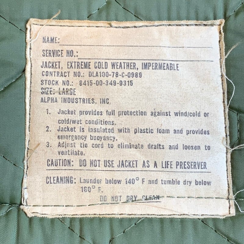 70's U.S.NAVY EXTREME COLD WEATHER IMPERMEABLE ALPHA社 ナイロンデッキジャケット オリーブ DLA100-78-C-0989 フローティングライナー リフレクター付 LARGE 希少 ヴィンテージ BA-1313 RM1682H