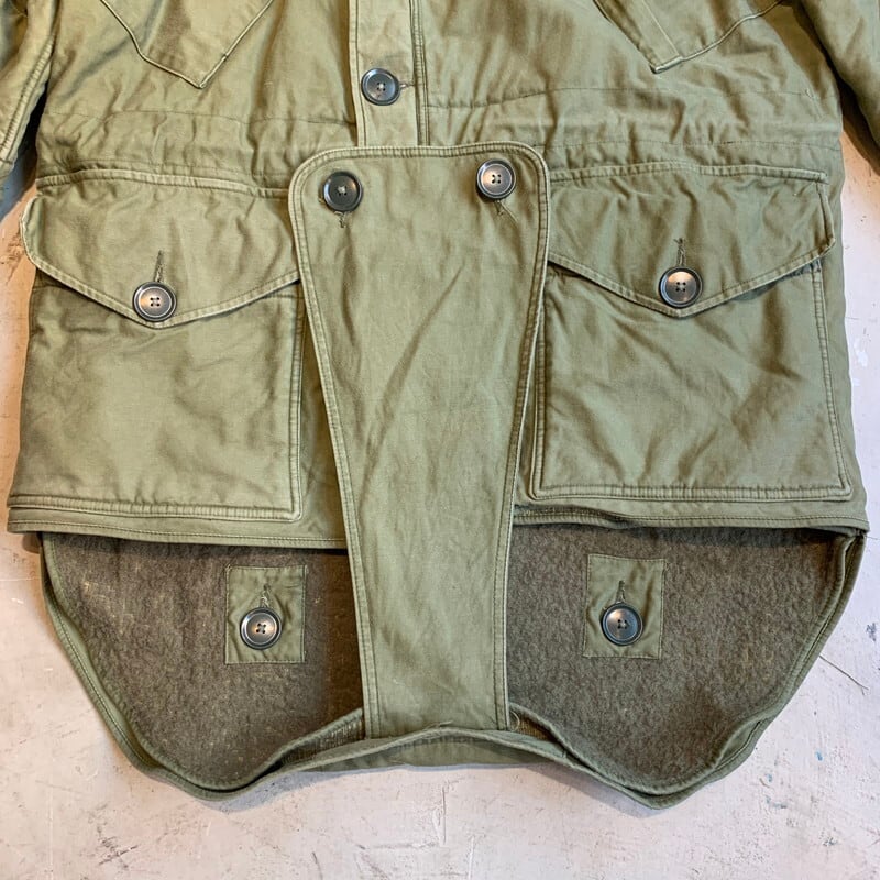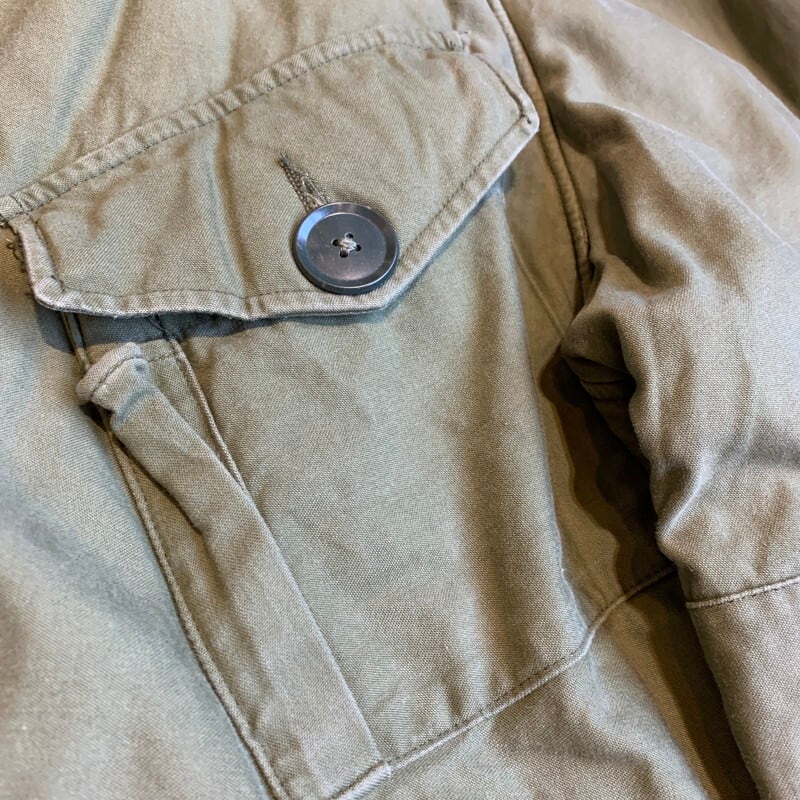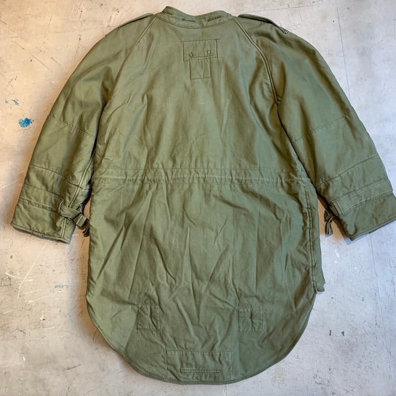 50年代頃のイギリス軍ミドルパーカーです。フードが着脱式で、フロントポケットが4つ付く3rdタイプと呼ばれる後期型です。正面から見るとジャケット丈ですが、背面が長い作りになっており、内側にはビーバーテールも付属します。大きく特徴的な皿ボタンも欠品無く揃っており、取っ手についたグリーンの玉も残っております。裏のボアに一部抜けは見られますが、ダメージ等も無く状態は良好です。残念ながらフードは欠損しています。サイズはなかなか出ない1。メンズのS~M相当です。イギリス軍のアイテムの名でも名品と呼ばれる希少なジャケットです。サイズが合う方やフードだけお持ちの方は是非いかがでしょうか。※シルエットが少し独特なので、ミドルパーカーの実物を見たり、試着された事がある方にお勧めします。