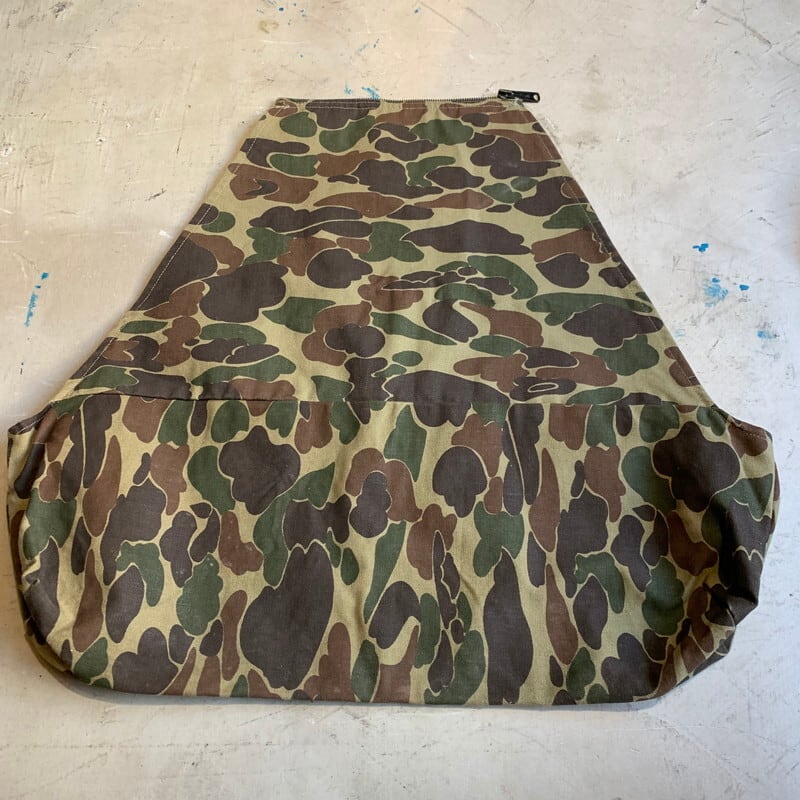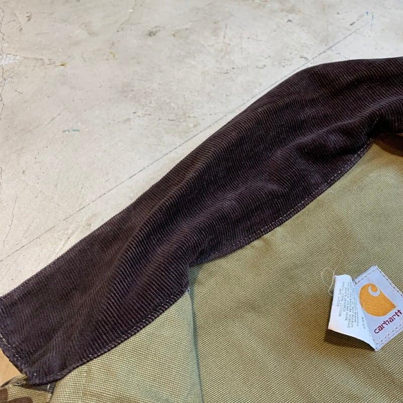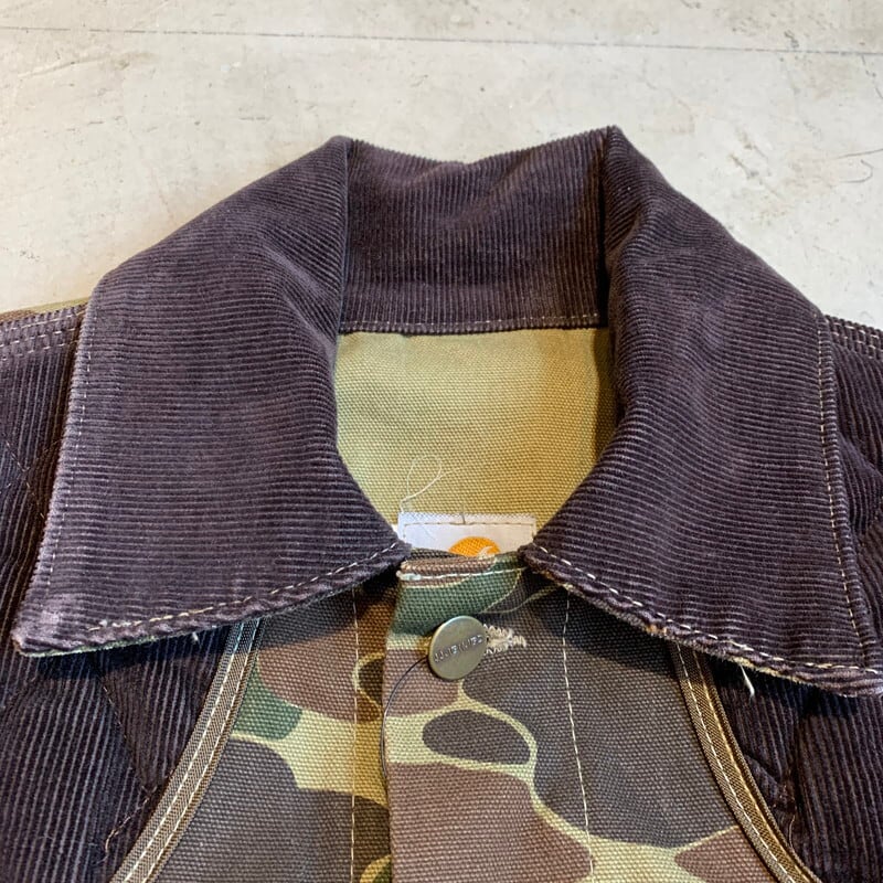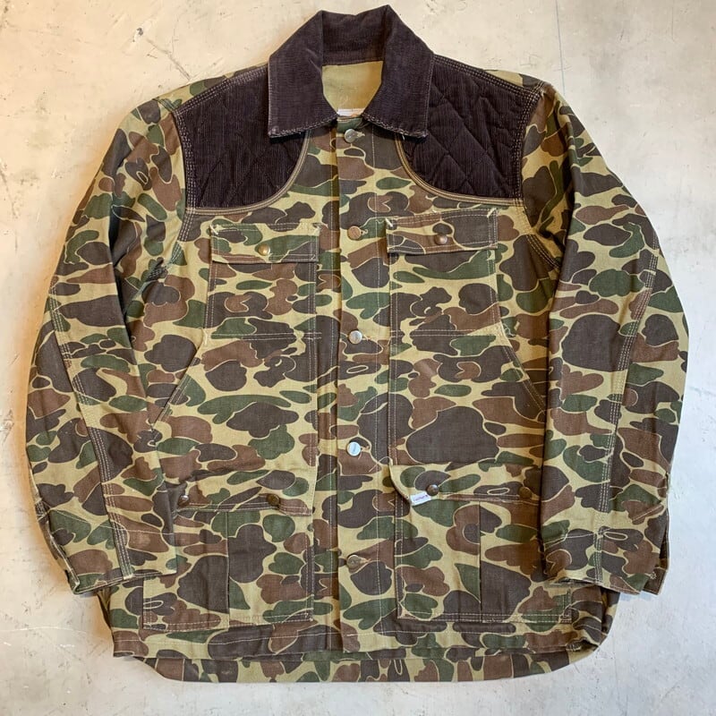 80年代から90年代頃のcarharttハンティングジャケットです。こrちらは1989年に発売された100周年記念モデルではありませんが、その前後で製造されていたダックハンターカモ柄のハンティングジャケットです。コーデュロイ製のガンパッチが付くモデルで、フロントポケットの形状はトラディショナルコートに似たデザインとなっていますが、一番下のフラップポケット内部にはカートリッジホルダーが付属します。背面の大きなゲームポケットは着脱式となっていますので、不要な場合は取り外しての着用が可能です。多少の擦れはございますが、非常に綺麗なグッドコンディションです。CRAFTED WITH PRIDE IN USAのタグが付く希少なアメリカ製です。ゴールデンサイズのMEDIUMです。人気のダックハンターカモ柄ですので、お好きな方は是非この機会にいかがでしょうか。