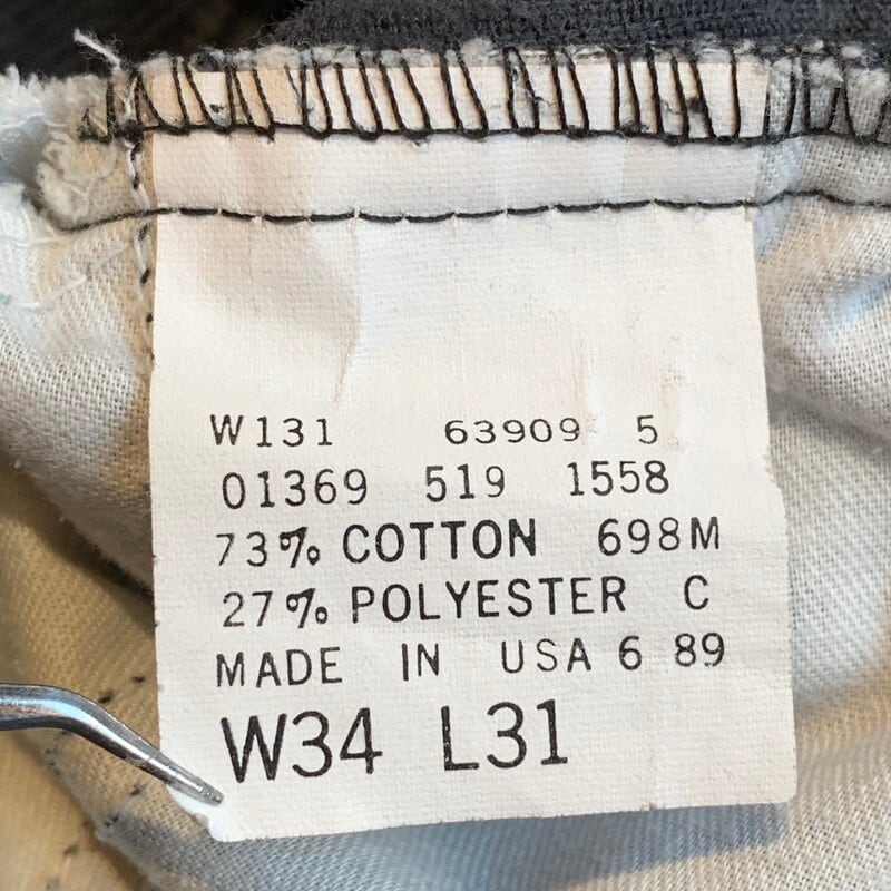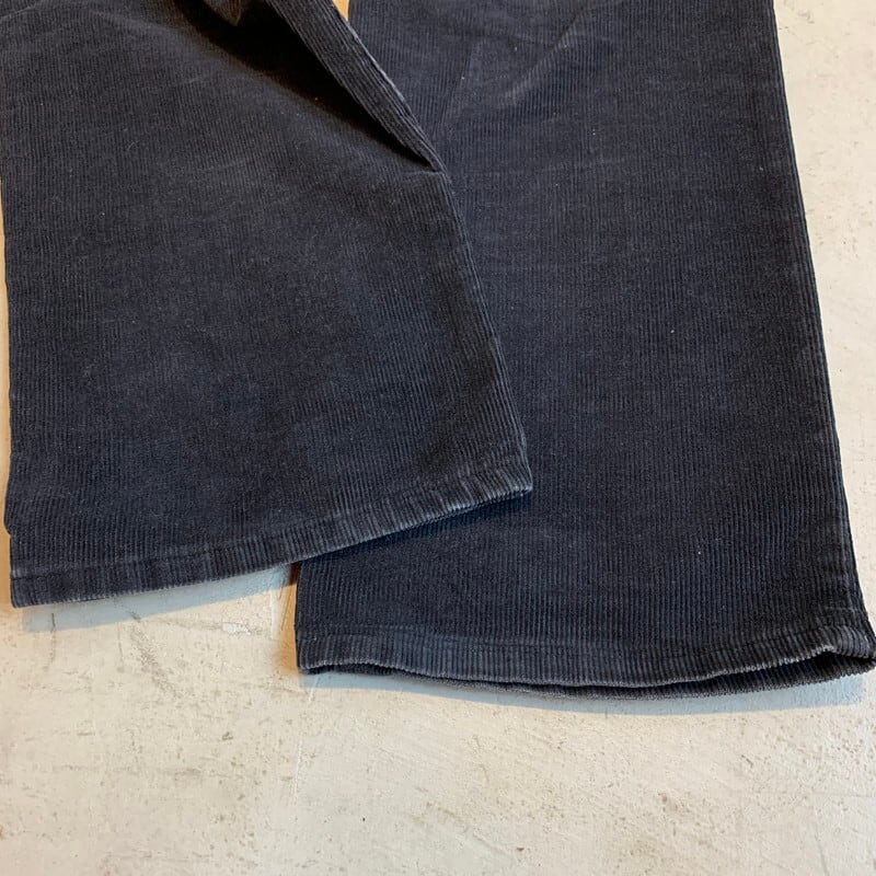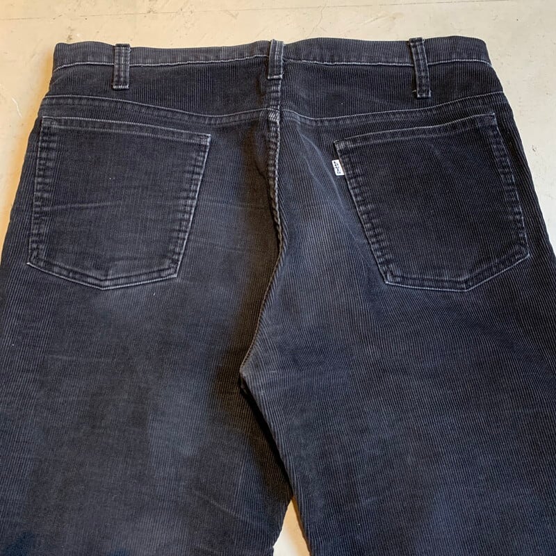 80年代のLevi's519-1558ブラックコーデュロイパンツです。519コーデュロイパンツの中でも特に人気の高いブラックです。綺麗なストレートシルエットでお探しの方も多いかと思います。フロントは社名入りのセミオートマチックジッパー、コットンポリエステル、89年USA製、白タブスモールe。全体的に墨黒のように色落ちした具合が◎。お尻と股の間付近の生地がやや薄くなっていますが、今のところ問題はなさそうです。気になる方は穿かれる前に補強しても良いかもしれません。サイズはW34とゴールデンです。ほかのカラーの519に比べ見つかりにくいアイテムですので、サイズが合う方は是非いかがでしょうか。