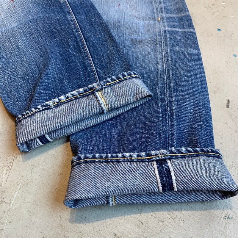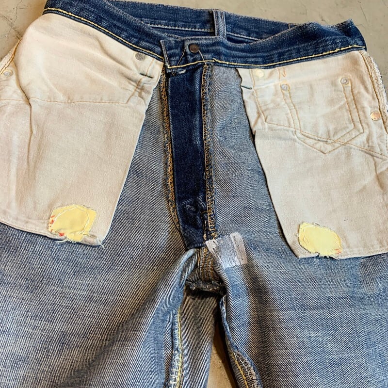 60年代頃のLEVI'S 502デニムパンツです。1954年頃にジッパーフライ仕様の501ZXXが発売され、1964年頃からXX表記が廃止されることとなり以降501ZXXから502へと品番が変更されました。トップボタンシルバー、42TALON、刻印4、フロントVステッチ、ウォッチポケット裏シングル、バックポケット裏シングル、赤タブBig E、不均等V、セルヴィッジ裏両面シングル。メリハリのある色落ちで、フロントジッパー付近は特に濃淡がはっきりしています。ジッパー前立て、ポケット付近にダメージ、股、両膝にリペアをが施されています。両方のスレーキにも当て布が施されています。裾にも擦れが見られます。Vステッチ仕様で、生地にはざらつきがあり、XXを彷彿とさせる1本です。同じジッパー仕様の505に比べ製造期間も短かったことから玉数も少なく大変希少なデニムと言えます。ウエストはW28。小さめサイズですので、女性の方にもお勧めです。サイズが合う方は是非いかがでしょうか。