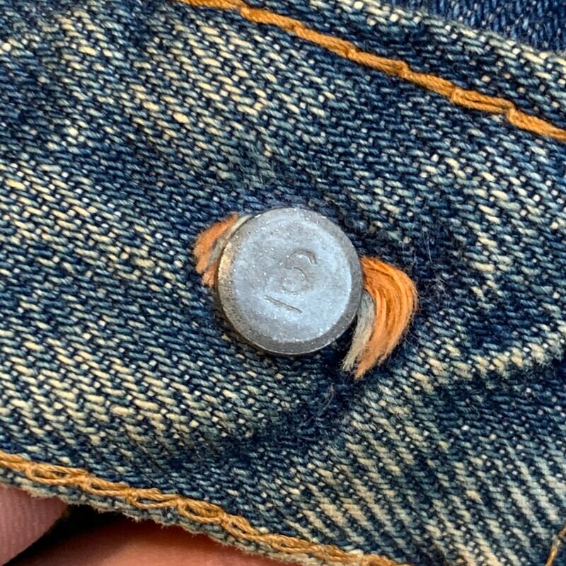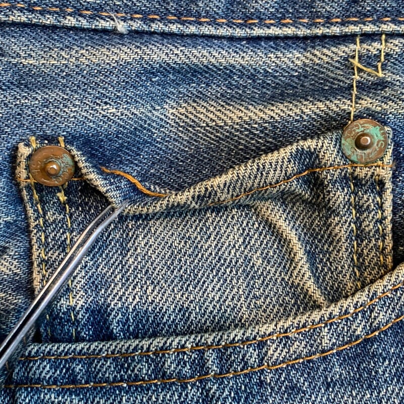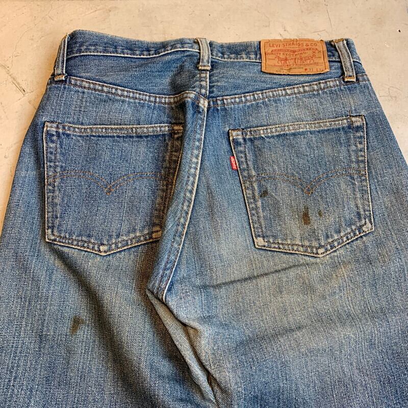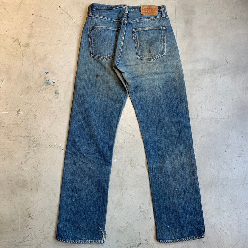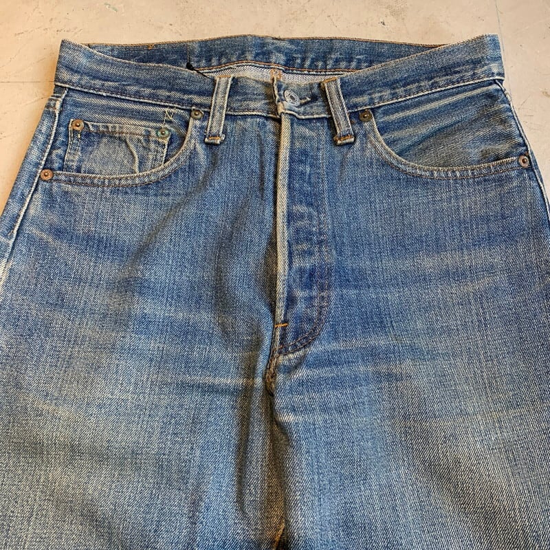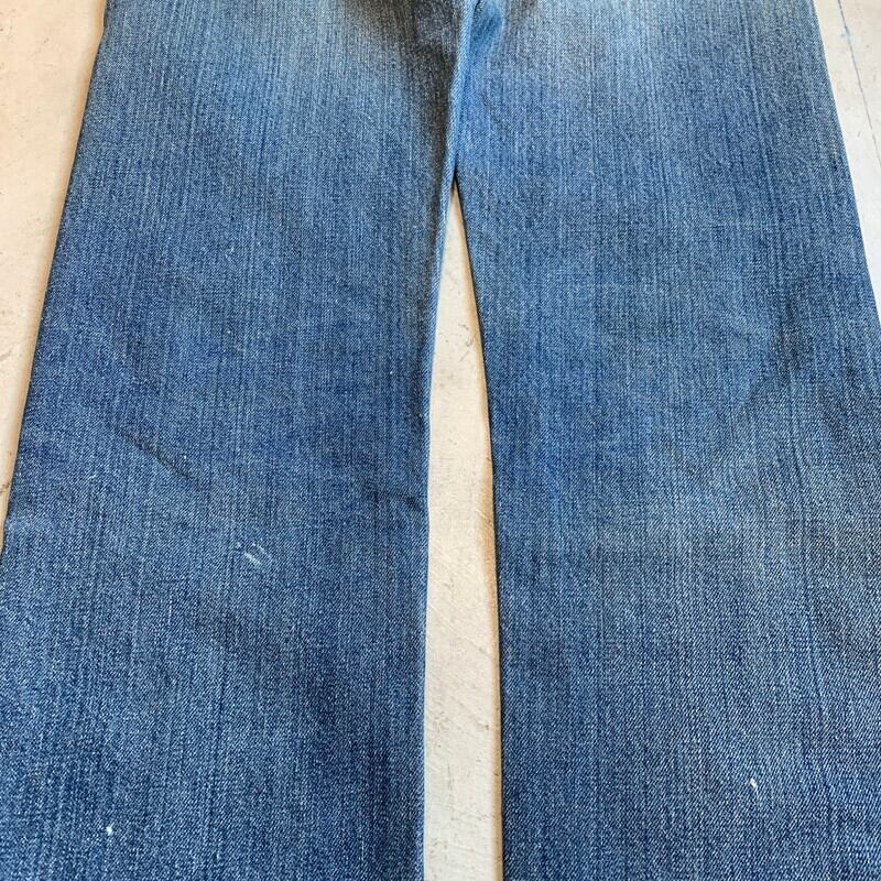 70年代頃のLevi's501デニム、66前期モデルです。フロントボタン裏刻印6、ウォッチポケット裏チェーン、バックポケット裏シングル、アウトシームセルヴィッジ、赤タブスモールe。66前期らしく綺麗に縦落ちが見られる良い個体です。内側の紙タグの印字は消えかかっていますが、恐らく76年頃のモデルと思われます。インシーム両裾に、5cmほどの裂けがございますが、ブーツを履く際にブーツカットのようなシルエットで着用されていたのだと思われます。簡単なリペアで修復可能範囲です。バックポケットに3か所、左バックポケット↓に1か所シミがございます。その他ダメージ等無くリペアもございません。最近は66モデルも価格が非常に高騰していますが、気兼ねなく穿くヴィンテージとして1本いかがでしょうか。表記はW31ですが、実寸W30です。男女ともにオススメな1本です。
