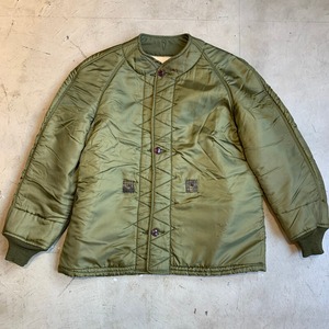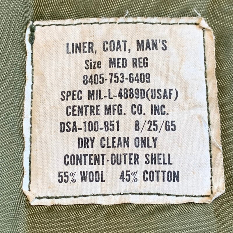 60年代のU.S.AIR FORCEキャトルジャケット用パイルライナージャケットです。MIL-L-4889D、65年採用と思われます。米空軍で採用されていたフィールドジャケット(通称キャトルジャケット)のライナーとして使用されたアイテムです。ナイロン地を内側に着用する仕様ですが、裏表どちらでも着用可能です。薄汚れは見られますが、ダメージは少なく生地のコンディションは良好です。リブも綺麗で、使用感はあまり感じられません。M-65のキルティングライナーに比べ防寒性も高いと思います。フロントには元からボタンが付かないモデルですので、男女共に着やすく、リバーシブルでも留めれる手製の拝みボタン(鼓ボタン)を取り付けています。U.S.ARMY、M-51のパイルライナーに比べ市場でも見かける事が少ないアイテムだと思いますので是非この機会にいかがでしょうか。
