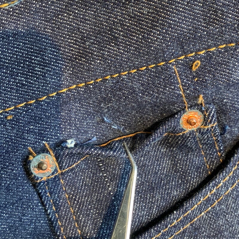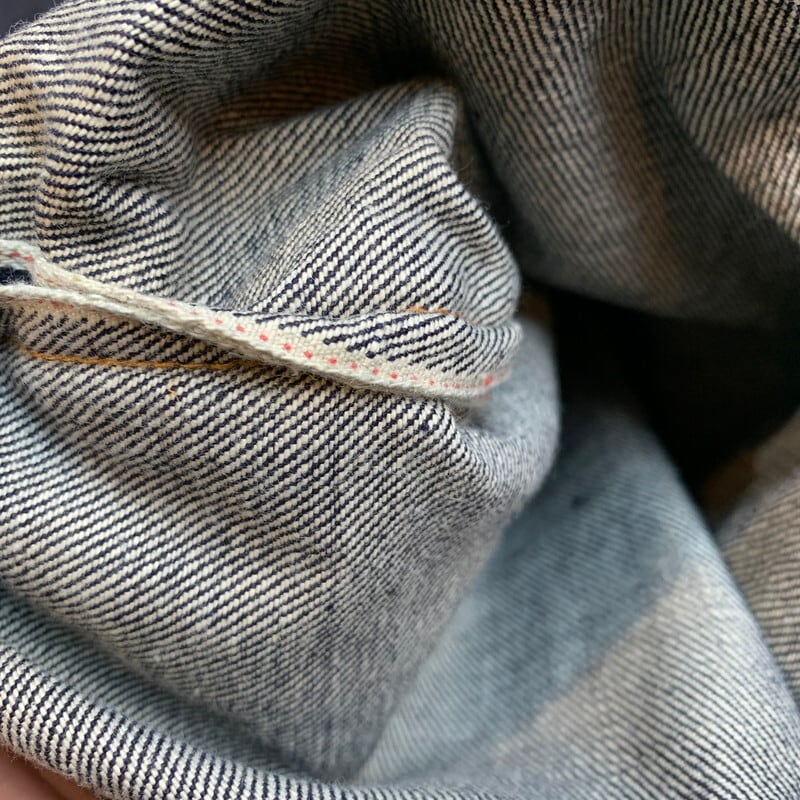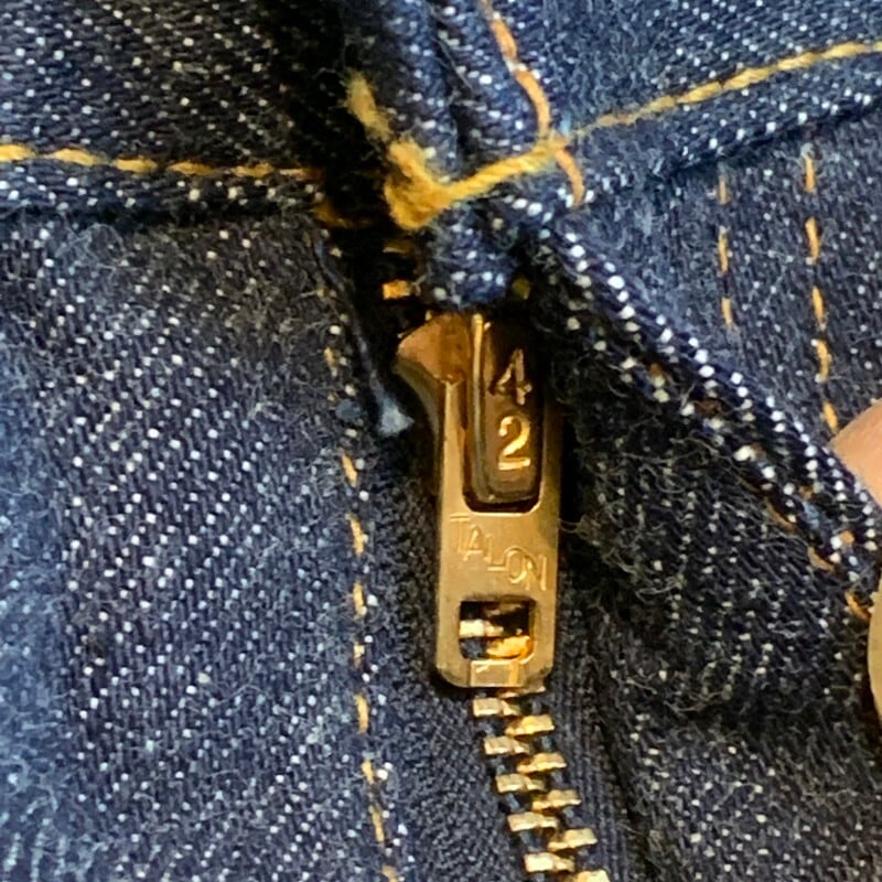 60年代から70年代頃のLEVI'S 502-0117デニムパンツです。フラッシャーが残る奇跡のデッドストック。トップボタンシルバー、刻印8、並行ステッチ、42TALON、ウォッチポケット裏チェーン、サイド赤耳、アウトシーム裏両面シングル、バックポケット裏シングル、赤タブBig E、不均等V、紙パッチ、Aタイプ、デカ文字。1960年代半ば頃に501ZXXの後継モデルとして誕生したのがこの502です。この502には初期のXXからの移行期にはWネームと呼ばれる501ZXXと502の両方のロットナンバーが記載されるモデルがあり、その後タイプ物へと移行するのですが、今回ご紹介のこちらは、Wネームからタイプへと移行した僅かな期間のみ見られるデカ文字で印字された仕様です。表のリベットに一部緑青が見られます。サイズはW38インチ。洗濯後縮みが見られるのでこのサイズを探している方も多いのではないでしょうか。近年ヴィンテージリーバイス人気も高まり、特にタイプ物のデッドストックとなればまさに垂涎のアイテムです。ここ1~2年でグングン価値が高まっています。着用はもちろんですが、コレクションとしても非常に価値の高いスペシャルピースです。