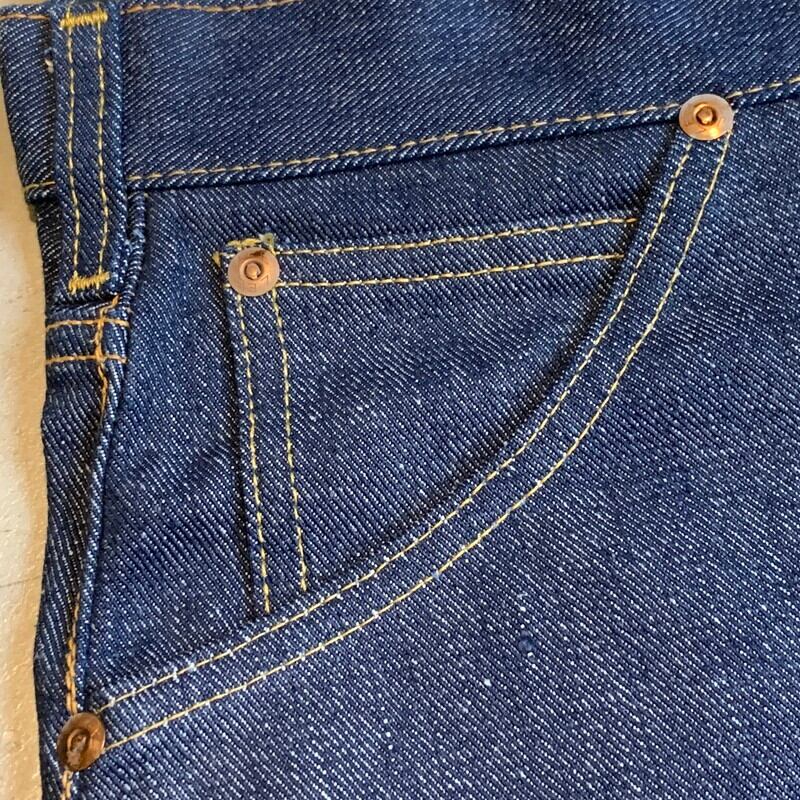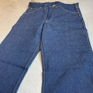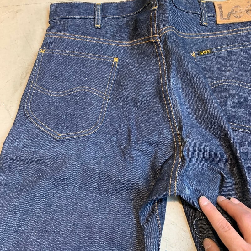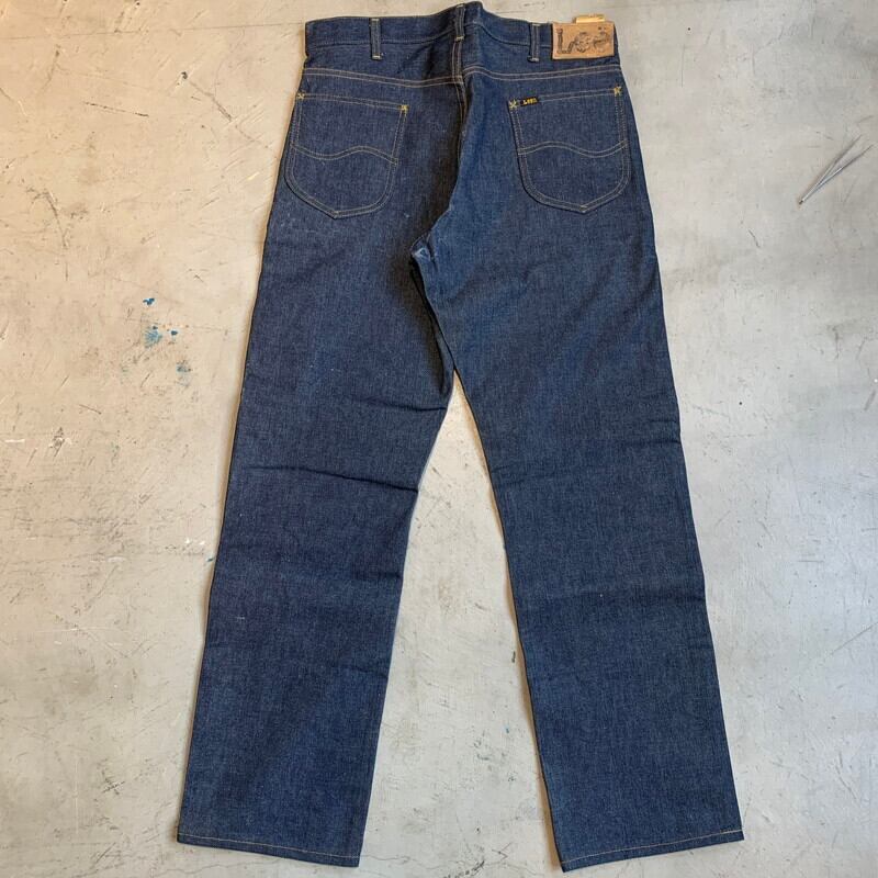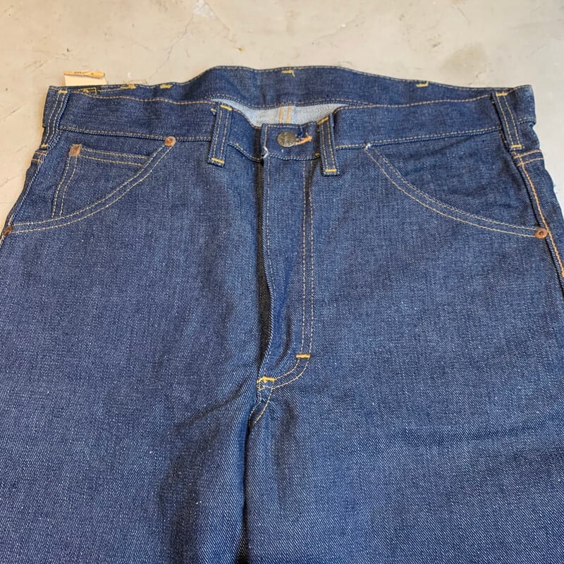 60s~70s頃のLee 101Z RIDERSデニムパンツです。フラッシャー付きの未使用デッドストックです。(フラッシャーは元から取れてポケット内に保管されていました)。サイド黒タグでR、MR表記が入りサイズ表表記が入るタイプで、101Zサイド黒タグの後期モデルです。フロントボタンはLee RIDERS、TALONのセミオートマチックジッパーが採用されています。バックポケット内側に当て布とユニオンチケットがございます。ピスネームにも®MRが付きます。サイド黒タグの後期モデルではなかなか見つからないアウトシームが両耳仕様です。101Zの最終モデルとは言えどフラッシャー付きのデッドストックは見る機会はほとんどありません。保管時に付いたであろう色抜けが一部見られ、革パッチにもやや擦れが見られますが、バキバキに糊の効いたこの個体を見つかる事自体レアですので、許容範囲だと思います。サイズはW34インチ。お探しの方も非常に多いゴールデンサイズです。ヴィンテージデニムの評価が高くなり、今後の入手は非常に困難といえます。着用はもちろんコレクションとしても価値の高いアイテムです。
