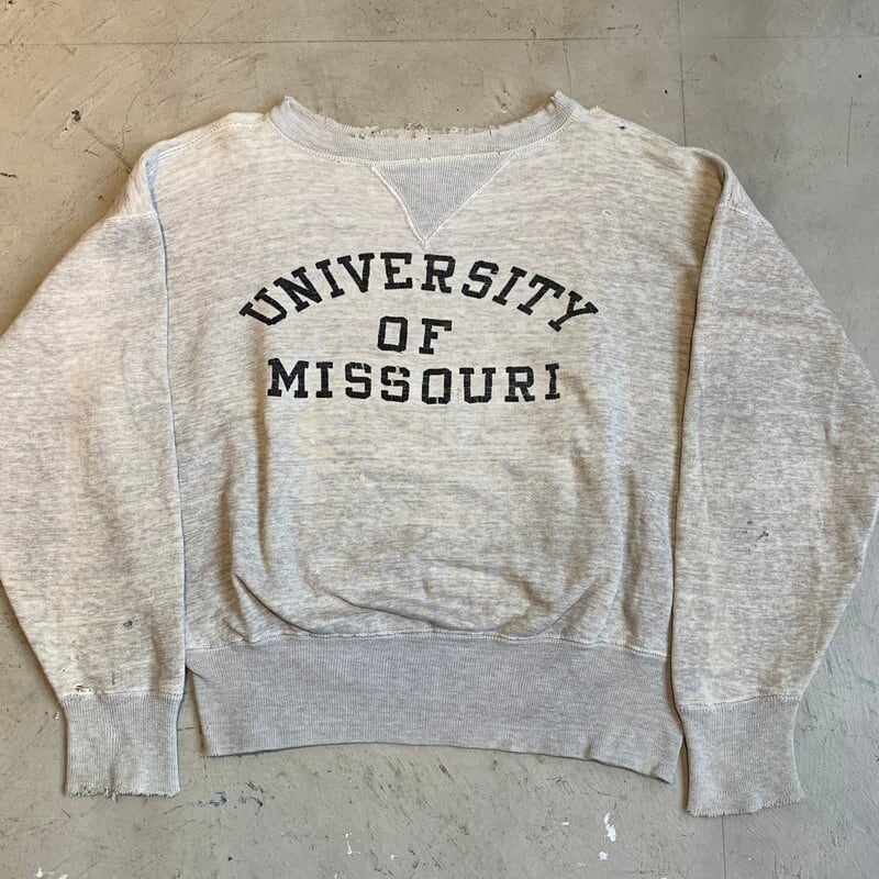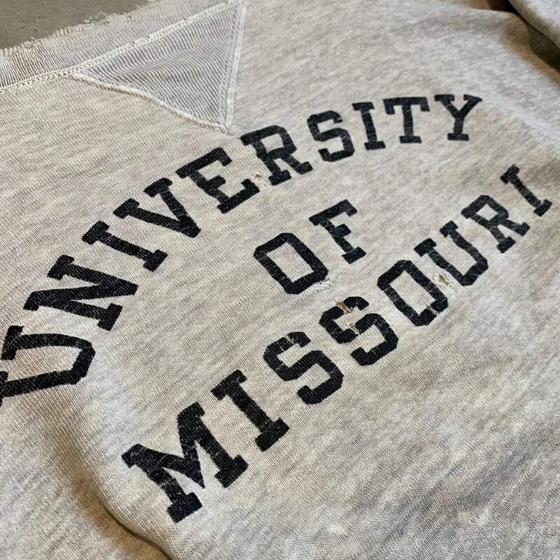 40's 50's UNKNOWN はめ込み両Vガゼットスウェット 2トーングレー フロッキー UNIVERSITY OF MISSOURI ミズーリ大学 カレッジ S~M位 サンプリング元ネタ ダメージ有り 希少 ヴィンテージ BA-1343 RM1712H
