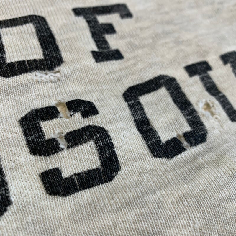 40年代から50年代頃のUNKNOWNはめ込み両Vガゼットスウェットです。1839年ミズーリ州コロンビアで創立した歴史あるミズーリ大学のカレッジプリントが入ります。元々はフロッキープリントが施されていたようですが、フロッキー部分が擦れてほとんど無くなっています。ガゼットや袖、リブ等は2本針で縫製されています。リブや肩周り、袖周り、プリント付近等多数ダメージが見られます。某有名レプリカントブランドがこのデザインをサンプリングして復刻していた様です。グレーにブラックのプリントはやはり王道ながら最高の組み合わせだと思います。サイズは着丈が短めですので、実寸はS~M相当。身幅はややゆったりとしています。小柄な女性もしくは、オーバーオールのインナーとしての着用でしたら男性でも着丈を気にせず合わしていただけると思います。ダメージは見られますが、ヴィンテージスウェットらしい良い表情の1着です。ダメージにご理解がある方やリペアを楽しめる方にお勧めな1着です。