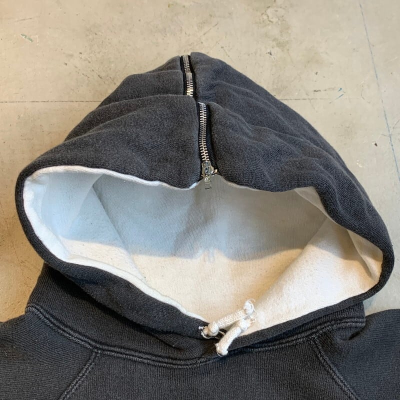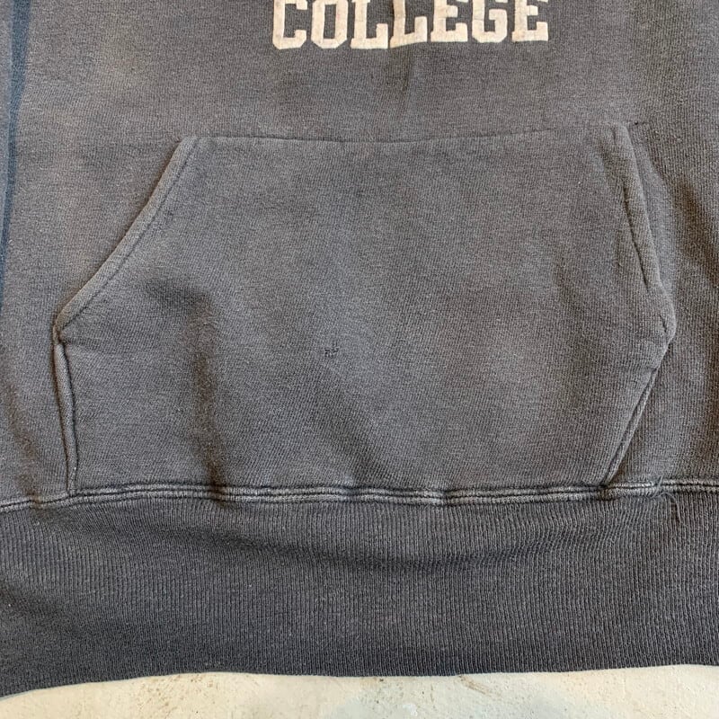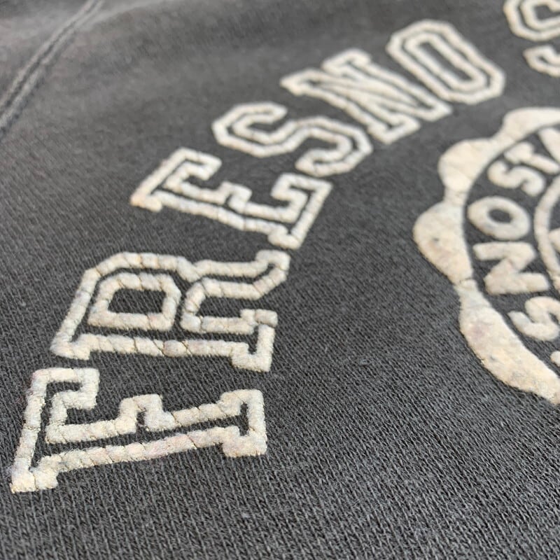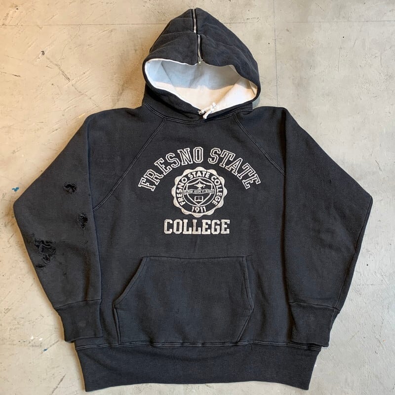 60年代頃のUNKNOWNラビットフードスウェットパーカーです。フードがジッパーで割れセーラーカラーのように広げる事が出来ます。このタイプではHealthknit社の物が有名ですが、こちらは縫製の違い等から恐らく他社が製造した物だと思われます。1911年に創立したカリフォルニア州立大学のフレズノ校のプリントがフロッキーで施されています。ブラックボディが経年で全体に褪色し、墨黒のような色合いが◎。残念ながら右袖に大きなダメージがございます。その他小さなピンホール等ございます。サイズはM位。袖にダメージはございますが、敢えてリペアはせずに、サーマルやカラフルなインナーを着てレイヤードを楽しんでも良いと思います。ヴィンテージスウェットの中でもブラックは希少ですので、サイズが合う方は是非いかがでしょうか。