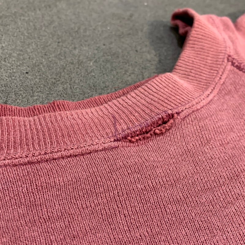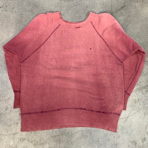 60年代頃のUNKNOWNラグランスウェットです。1953年にニューヨーク州トロイで設立された大学のプリントが入ります。ペンキプリント特有のクラックが良い雰囲気です。全体にフェードしており、ボディや袖に小穴がいくつかございます。袖リブにも擦れが見られます。首リブに1か所3cmほどの裂けがございます。一つ前にご紹介したスウェットに比べフェード感は少な目ですが、エンジ色の濃淡がヴィンテージスウェットらしい1着です。こちらは身幅は特に広くなくジャスト目なM位。ベイカーパンツなどのミリタリーパンツとの相性は抜群ですので、お好きな方は是非いかがでしょうか。