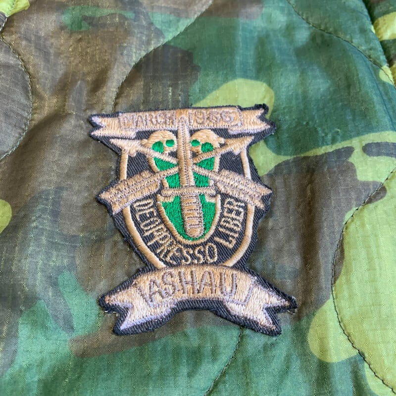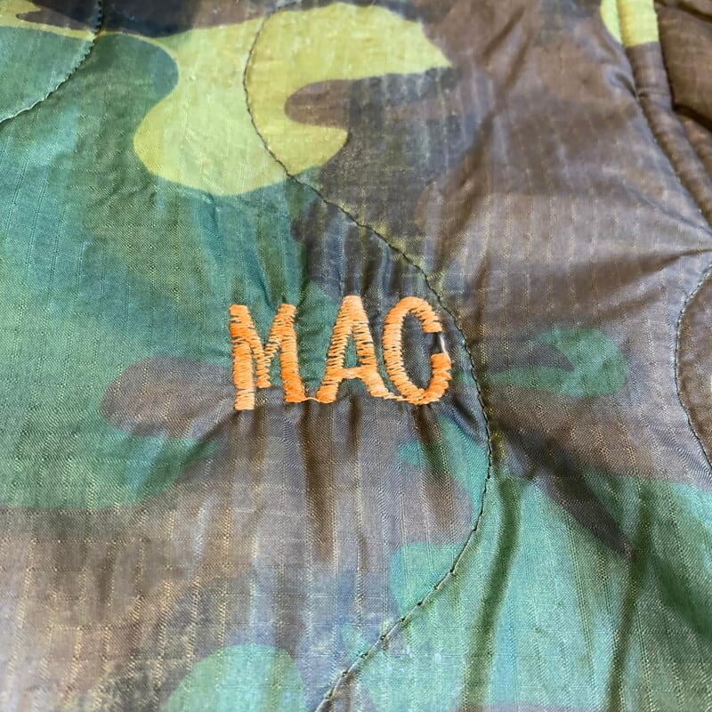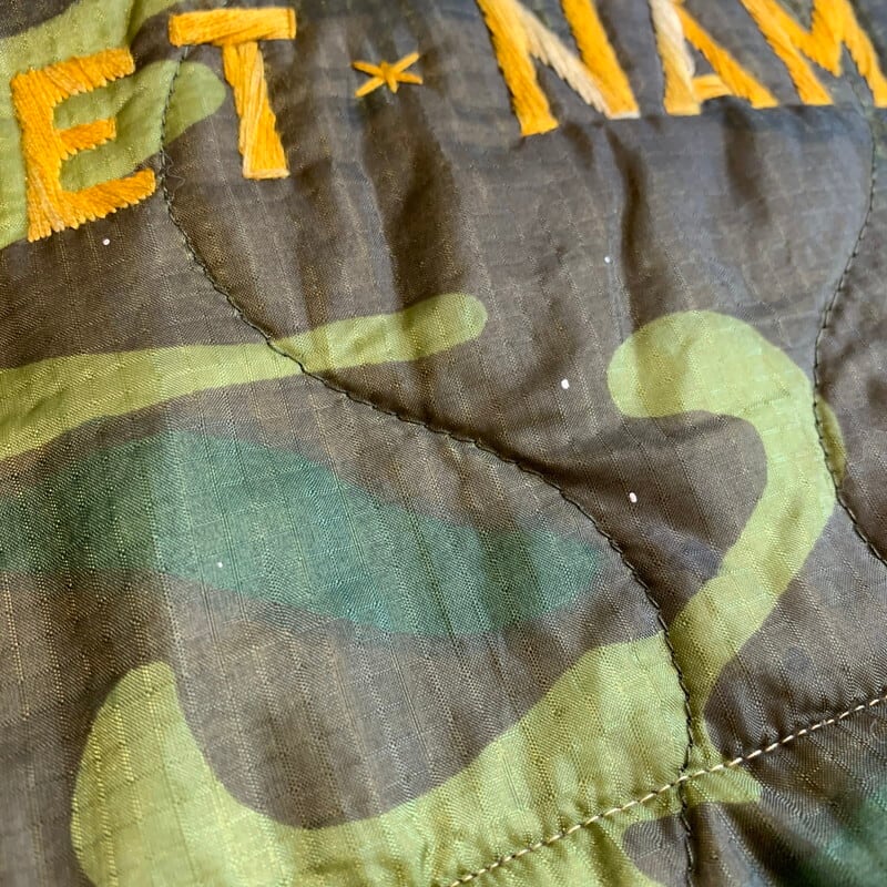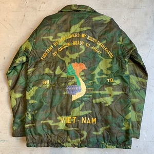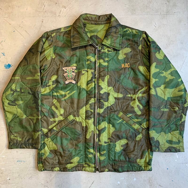 70年代頃のベトナムスーベニアジャケットです。キルティングのポンチョライナーを使用し作成された兵士たちのスーベニアアイテムで、裏地にサテンが付かないタイプです。左ポケット内側にはポンチョライナーのミルスペックが残っており、縫い目ですべては見えませんが恐らくDSA100-68-C-0689と記載されています。胸元には制作を依頼した兵士の物と思われるネームが刺繍されています。右胸には1966年3月9日に繰り広げられたアーシャウの戦いに参加したアメリカ陸軍特殊部隊(U.S.SPECIAL FORCE)のワッペンが貼り付けられています。上部と下部が剥がれていますので、縫い付けもしくは再度貼り付けをした方が良いと思います。フロントジッパーは比較的新しいYKKのジッパーに交換されています。背面にはベトジャンでお馴染みのマップ刺繍が施されています。背面裾付近に小さなペンキ飛びや薄いシミ等見られますが、その他ボディにダメージ等無くグッドコンディションといえる1着です。170cm70kgのスタッフが着て袖、着丈は丁度良い具合です。身幅が若干細目に感じますのでサイズはM位だと思います。程度の良いスーベニアジャケットはなかなか出ないと思いますので、お探しだった方は是非いかがでしょうか。