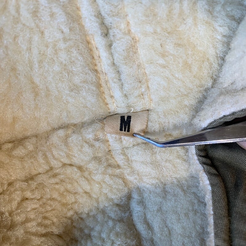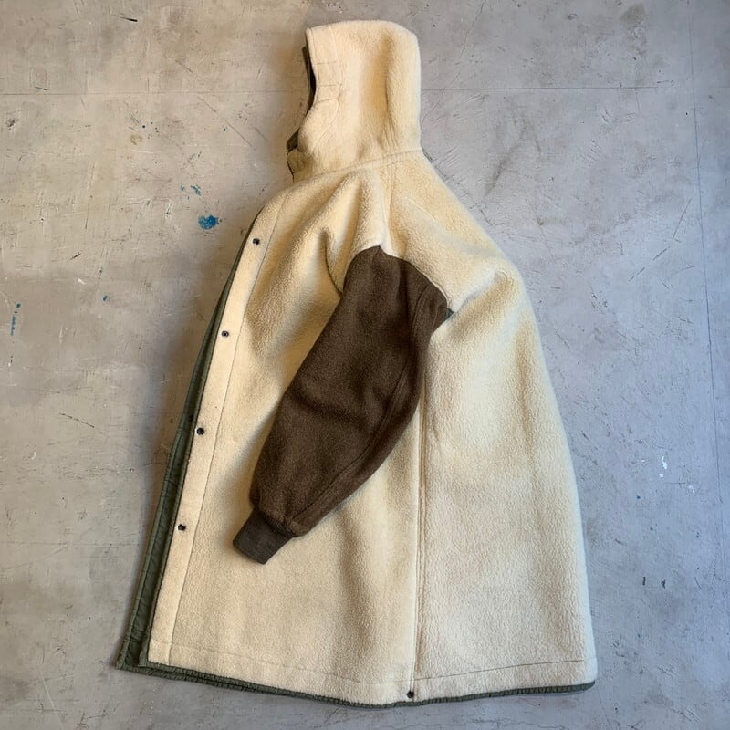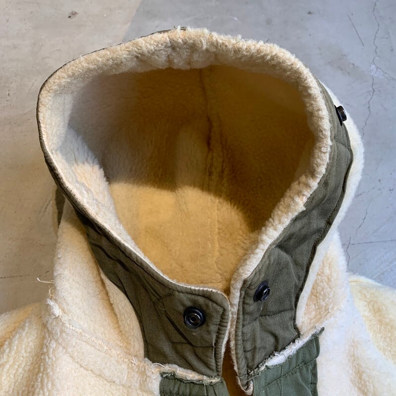 1940年代頃のU.S.ARMY M-1947ボアライナーパーカーです。M-1951モッズパーカーやM-65フィッシュテールパーカーの元祖となるM-1947フィールドパーカーに取り付けるボアライナー単体です。M-1951に見られるパイルでは無く化繊のボアがボディとフードに使用されており、袖はウールに切り替えとなっています。元はライナーとして使用する為、スナップボタンは両サイド共に凸型ですので、フロントを留める事はできませんが、単体で羽織ってもかっこよいアイテムです。裏地(着用する際の表)の首元と裾にうっすらとしたシミがございます。虫食い等は無くリブも綺麗です。サイズはMですので、男女共に着やすいサイズ感だと思います。M-1947のシェルだけをお持ちの方や、ミリタリーライナーを探されていた肩は是非いかがでしょうか。