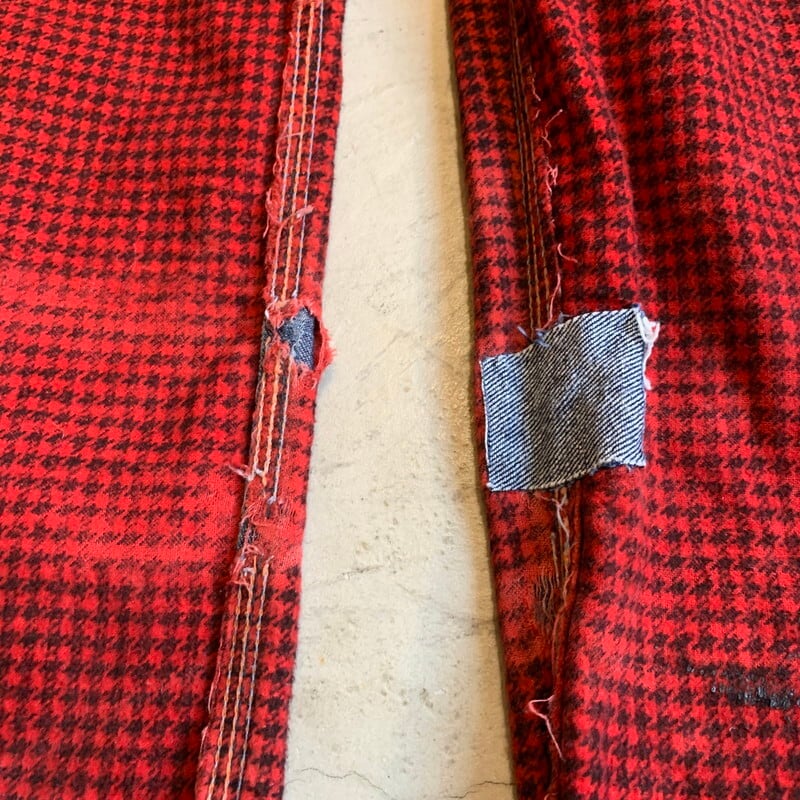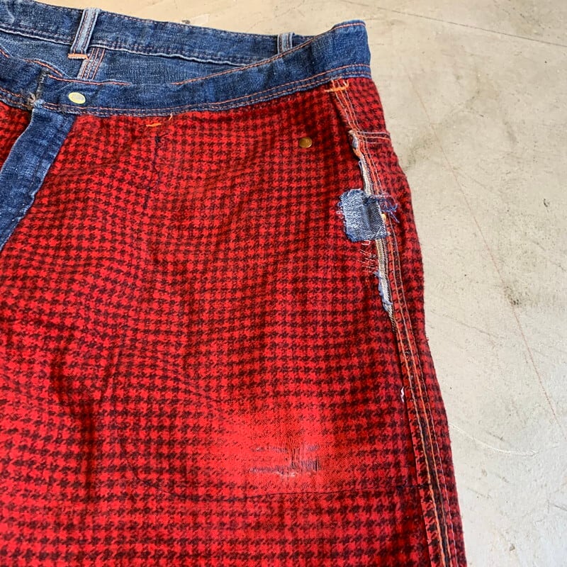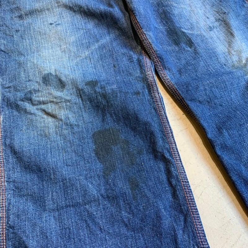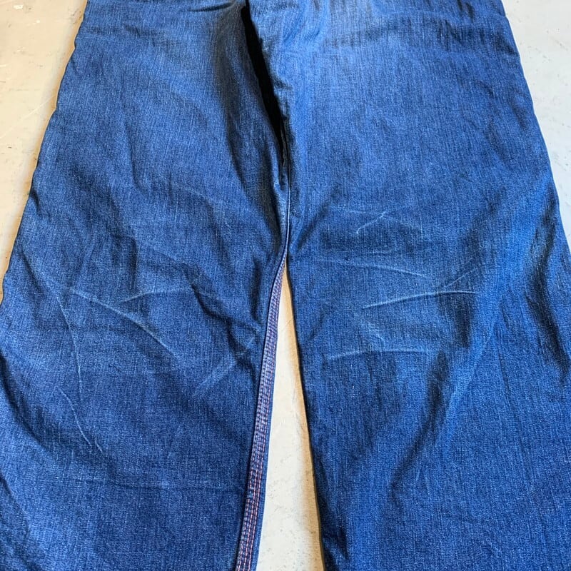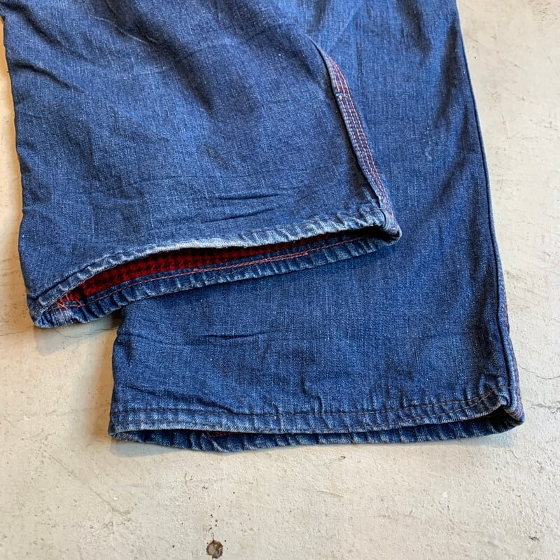 50年代頃のBLUE HORSESHOE BRANDデニムペインターパンツです。詳細が不明なマイナーブランドです。裏地にネル生地が備わるタイプです。トップはブランドロゴ入りのスナップボタン、ジッパーはSERVAL社のピンロックジッパーが使用されています。フロントポケットはリベット打ち、バックポケットはバータックで処理されています。オイル染みや色落ちがワークウェアらしい1本です。右ポケット、左ポケットにリペアがあり、左ポケットはリペアの関係で深さが浅くなっています。小さなリペアもいくつかございます。ライニングのネルは股の部分が一部擦り切れています。ブランケットライナーが付くデニムジャケット同様に、ハチノスも見られます。古い年代のペインターパンツも見つける事が難しくなってきましたが、ライニング付きは特に希少だと思います。ウエストはW33~34インチとゴールデンサイズです。程よくゆったりとしたシルエットでオススメです。
