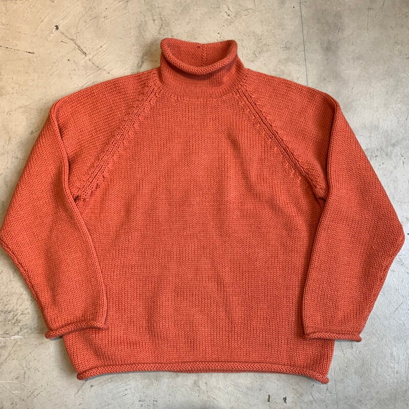 90年代頃のJ.CREWロールネックウールセーターです。OLD GAPと共に人気の高いブランドです。ジェイクルーの定番ともいえる首、袖、裾が巻き上がったデザインが特徴のアイテムです。こちらはウール100%を使用しています。若干の毛羽たちはあるもののダメージや汚れなどほとんどございません。S表記ですが、ゆったりとした作りですので、M~L相当だと思います。綺麗なオレンジ色ですので、コーディネートの差し色としてとても使い易くデニムやミリタリーアイテムとも相性が良いのでオススメです。90's頃のグッドレギュラーをお探しな方は是非いかがでしょうか。