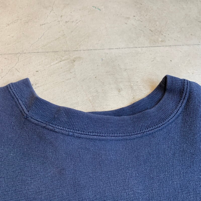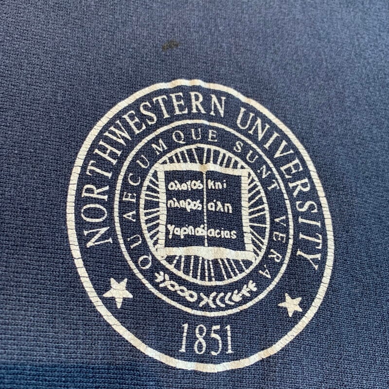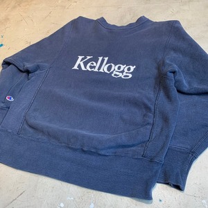 80年代のChampionリバースウィーブスエットです。カレッジ物に付くことが多い2枚タグ(大学別注カラーなどで後染めしたボディの色落ちを考慮して洗濯は分けて洗う事。といったことが書かれています)です。1908年にノースウェスタン大学の商学部として創立されたケロッグ経済大学院のプリントが両面に施されています。ボディはネイビーで、全体に色褪せがございます。小さなシミ等ございますが、リブ裂け等のダメージはございません。1979年にノースウェスタン大学がコーンフレークで成功を収めたケロッグ創業者の息子(ジョン・ケロッグ)の基金から寄付を得た事で名称にKelloggと入るようになったそうです。何気ないプリントでも深堀するとおもしろい発見がありますね。リバースの両面プリントも比較的少なく人気が高いアイテムなのでサイズが合う方は是非この機会にどうぞ。Mサイズです。