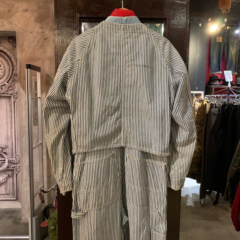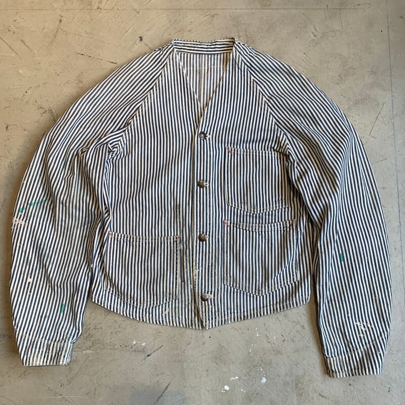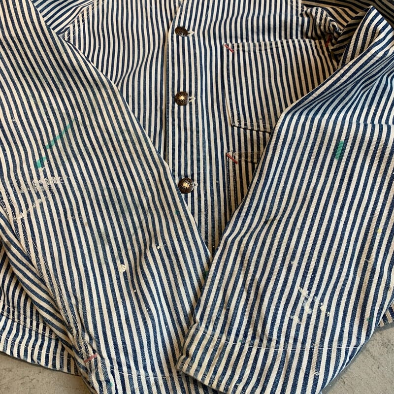 50年代頃のPAY DAYエンジニアジャケットです。アメリカを代表する3大ストアのJC Pennyが展開するプライベートブランドです。屋内作業用のワークジャケットの1種で、ノーカラーでショート丈という動きやすさ重視で作られたアイテムです。ヒッコリー生地ですが、幅の広めなストライプですので、クラシカルな雰囲気でとてもかっこよい1着です。タグは欠損していますが、恐らく黄色と赤んも2トーンのタグが付いていた物だと思います。ワークウェアらしく、袖等にペンキ汚れが見られ袖口にも擦れがございます。背面にも筋のような汚れもございます。古い年代のアイテムですが、生地もまだまだしっかりとしています。サイズは小さめで、36前後だと思われます(実寸をご確認ください)。元々ショート丈なので、レイヤードスタイルがお好きな方にお勧めなアイテムです。ゴリゴリのワークスタイルはもちろんですが、少し綺麗目なカジュアルスタイルのハズシにも使えますので興味のある方は是非いかがでしょうか。同年代頃のオーバーオールもございますので、セットで着用してもとてもかっこいいアイテムです。