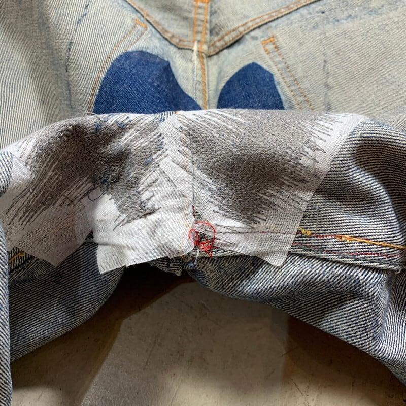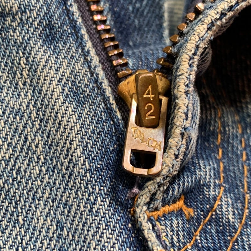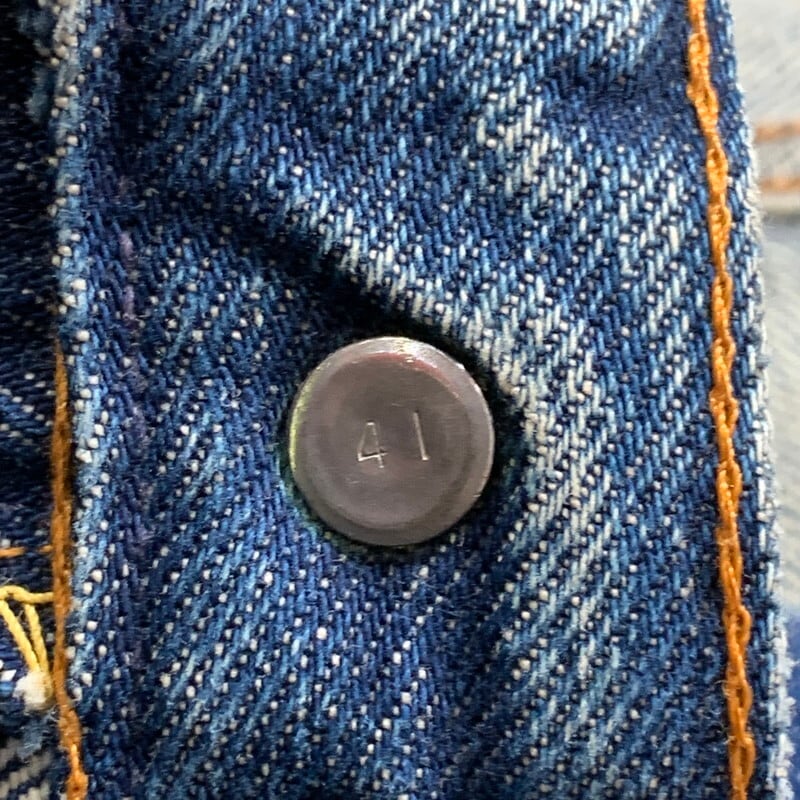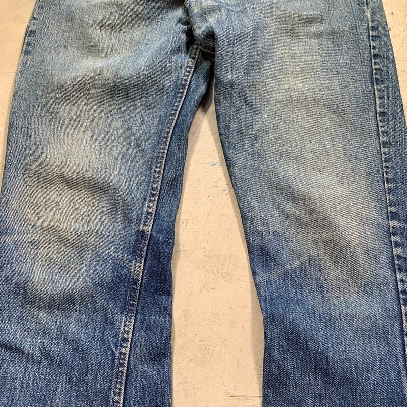 70年代のLevi's 646-0217ベルボトムデニムパンツです。60年代から70年代にかけてヒッピーと呼ばれる若者たちに人気を博したことで有名なアイテムとして知られています。ボタン裏刻印41、42TALON、オレンジタブ、Big E。色残りは4割程度で、ヒゲやハチノスがうっすらと確認できます。お尻部分に簡易的なリペアが施されていましたが、業者さんにお願いして綺麗にタタキ直してもらいました。生地が張り付けられていた箇所に若干接着剤が残っていますが、着用に問題はなさそうです(裸で穿いたらザラっとするかもしれません)。股付近にもリペアがございます。ここ数年ベルボトムが再注目され、人気も高まっています。646はそのベルボトムの代名詞的存在ですので、お探しだった方は是非いかがでしょうか。色落ちの雰囲気も良いので、スエードやレザージャケット等と合わせてみてはいかがでしょうか。実寸W34インチのゴールデンサイズです。