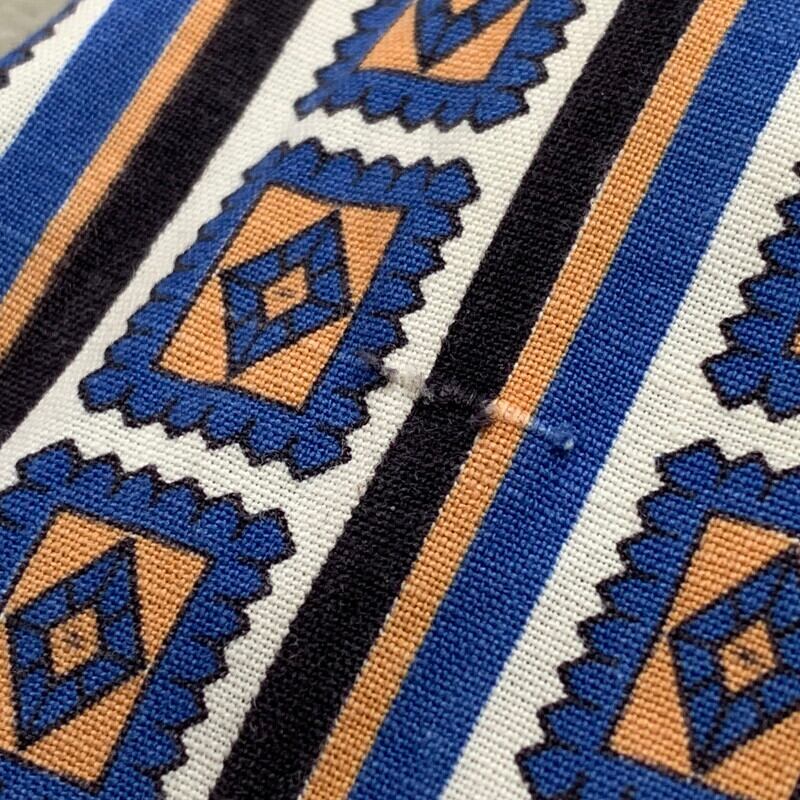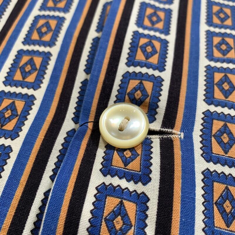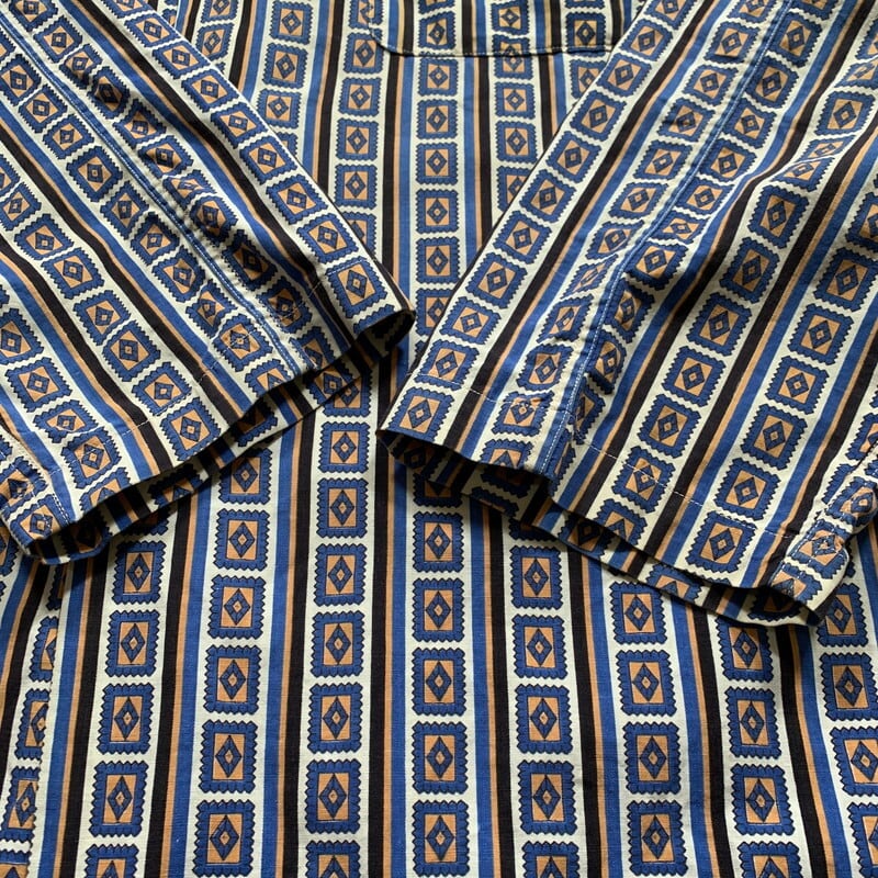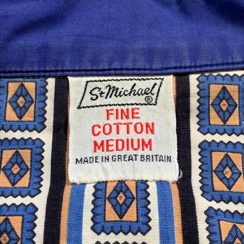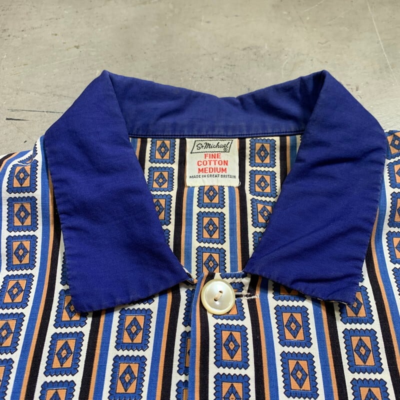60年代から70年代頃のSt Michael プリントコットンパジャマシャツです。1884年にイギリスのリーズで創業したM&S(Marks&Spencer)が展開していたプライベートブランドのアイテムです。アメリカでいうストアブランド物です。コットン地に小紋がプリントされたデザインで、襟とポケット縁がブルー単色で切り替わっています。袖はボタン留めの無い筒袖。フロントは4つボタンで非常に簡素な作りをしています。1番下のボタンはスペア用です。右袖二の腕付近に糸抜けのような箇所がございますが、裂けている訳ではないので問題なさそうです。全体にうっすらと褪色しています。ダメージは特にございません。パジャマシャツですので、MEDIUMサイズですが若干ゆったりとした印象です。通常のシャツに比べパジャマシャツ特有bの少しゆるっとした印象ですので、デニム等のワークウェアよりスタプレやフレアボトム、とろみのあるスラックス等と合わせると雰囲気も良いのではないでしょうか。