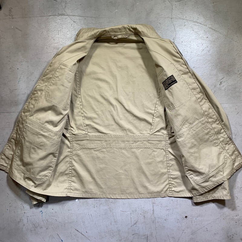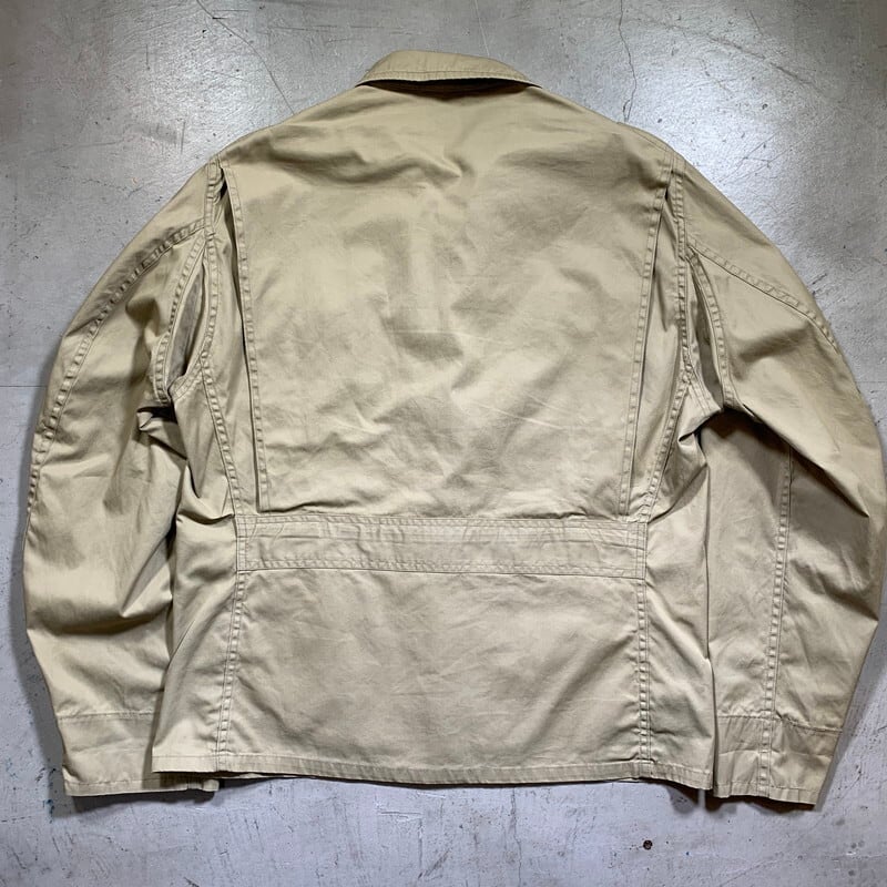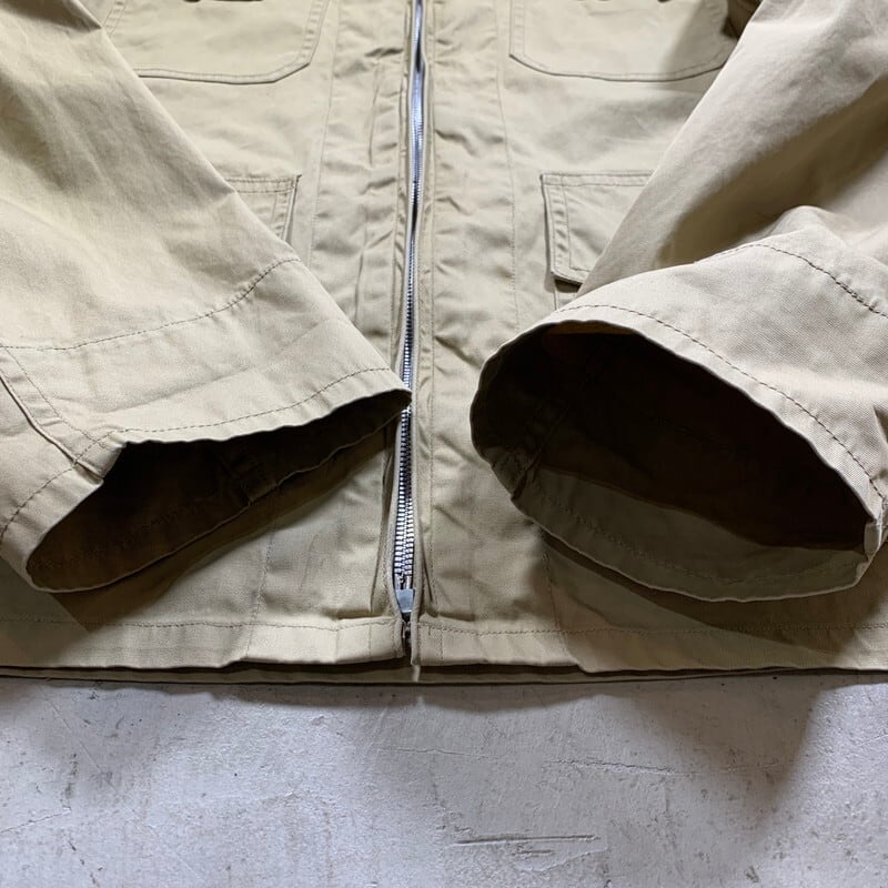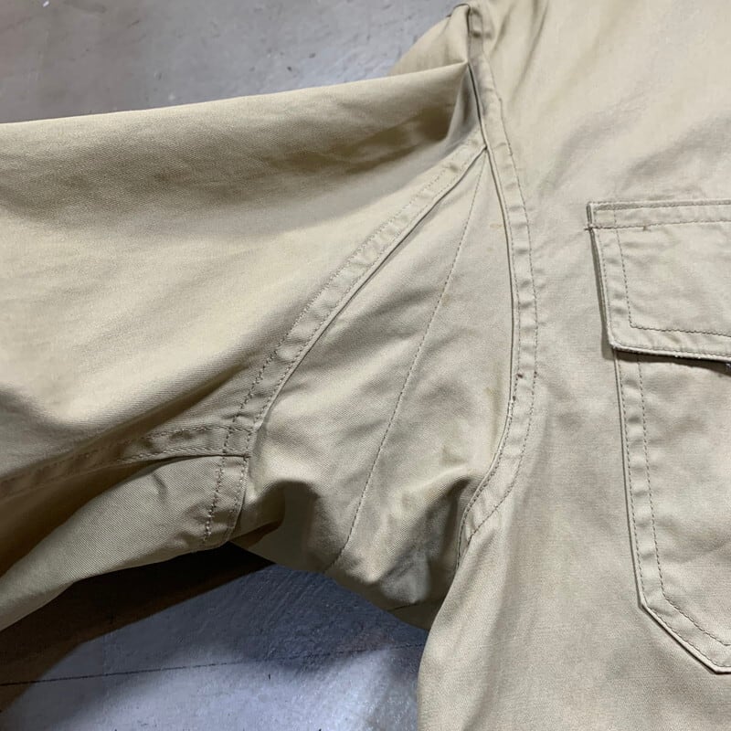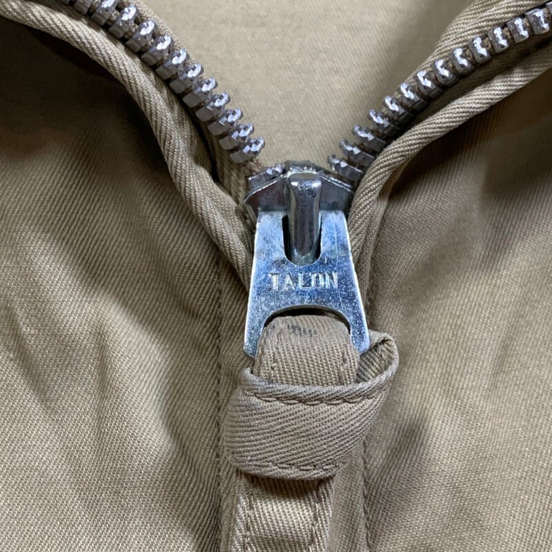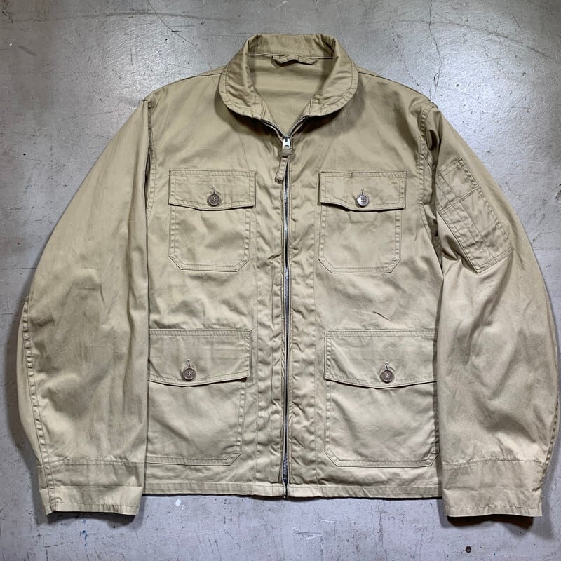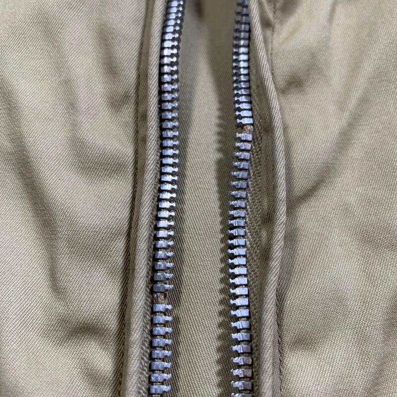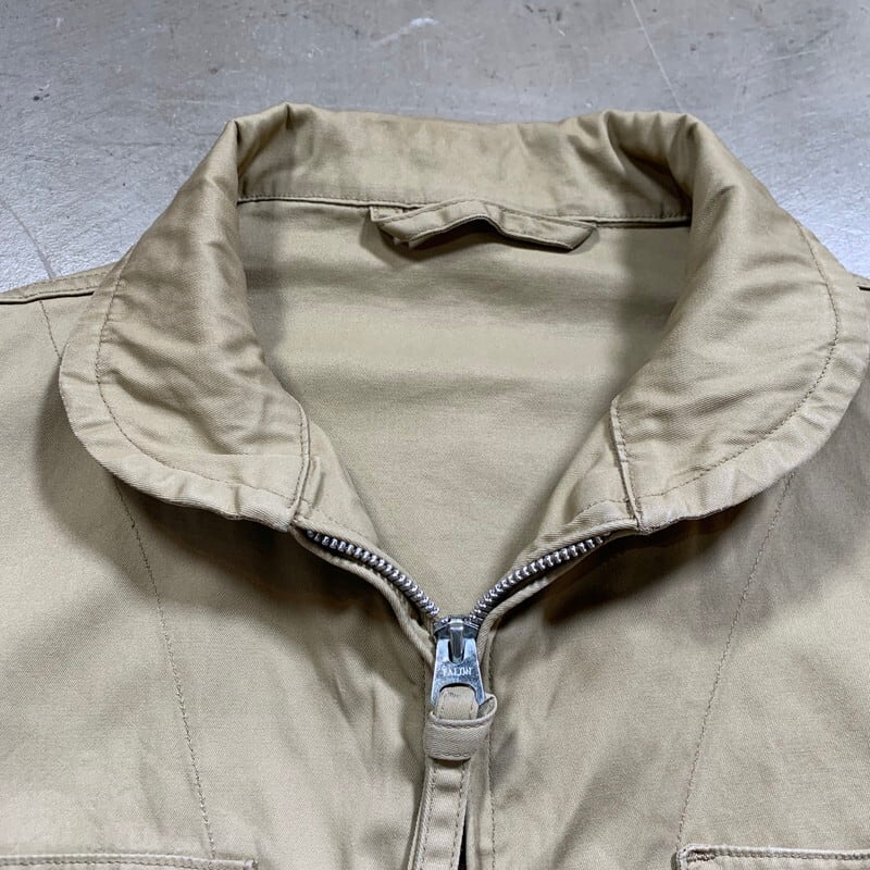 50年代頃のU.S.NAVYサマーフライトジャケットです。正式名称は、JAKET,FLYING,VERY LIGHT。ミルスペックはMIL-J-7758Aです。米海軍所属の航空隊等に支給されていた夏季用のジャケットで、M-421シリーズやAN-J-2等の後継モデルです。様々なディティールが存在していたサマーフライトジャケットですが、こちらは、小ぶりなショールカラーに4つポケット、左袖にはペンホルダーがございます。フロントはTALONのアルミジッパーを使用しています。ジッパーの歯がいくつか抜けていますが、開閉は可能です(素早く上げ下げすると少し引っ掛かりがあるので、ゆっくり開閉することを推奨します)。コントラクターはハンティングウェアでも有名なDRYBAK社が請け負っています。背面にはアクションプリーツが入り、脇下にもハンティングウェア等に見られるマチ仕様となっており、腕回りの稼働がしやすい様設計されています。薄汚れはございますが、ジッパーの歯こぼれ以外にダメージ箇所はございません。古いミリタリーウェアとしては非常に綺麗な個体と言える1着です。サイズは40。U.S.NAVY関連の中でも古着市場に出にくいサマージャケットで、ゴールデンサイズです。お探しだった方は是非この機会にいかがでしょうか?春先に使えるグッドアイテムです。