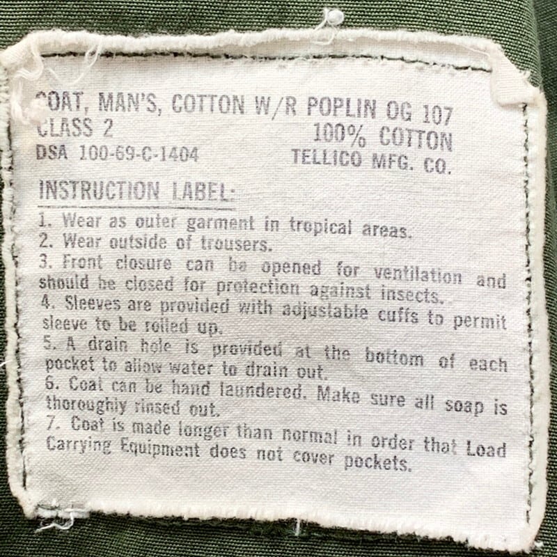 60's U.S.ARMY ジャングルファティーグジャケット ノンリップ 3rd オリーブグリーンTELLICO MFG.CO. OG107 DSA100-69-C-1404 MEDIUM LONG 米軍 NAM戦 美品 希少 ヴィンテージ BA-1390 RM1759H