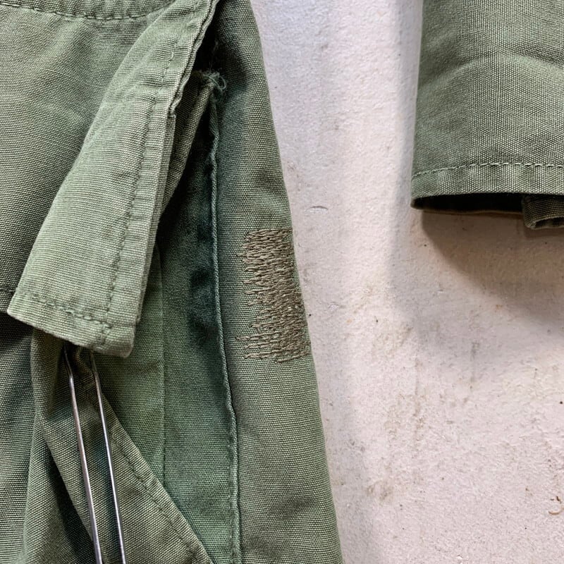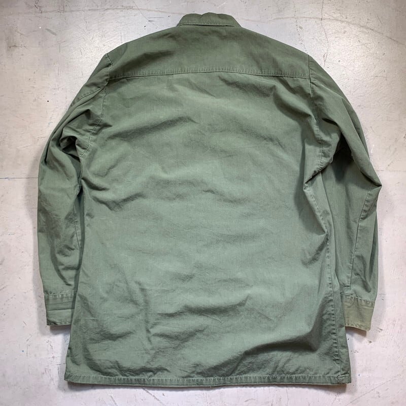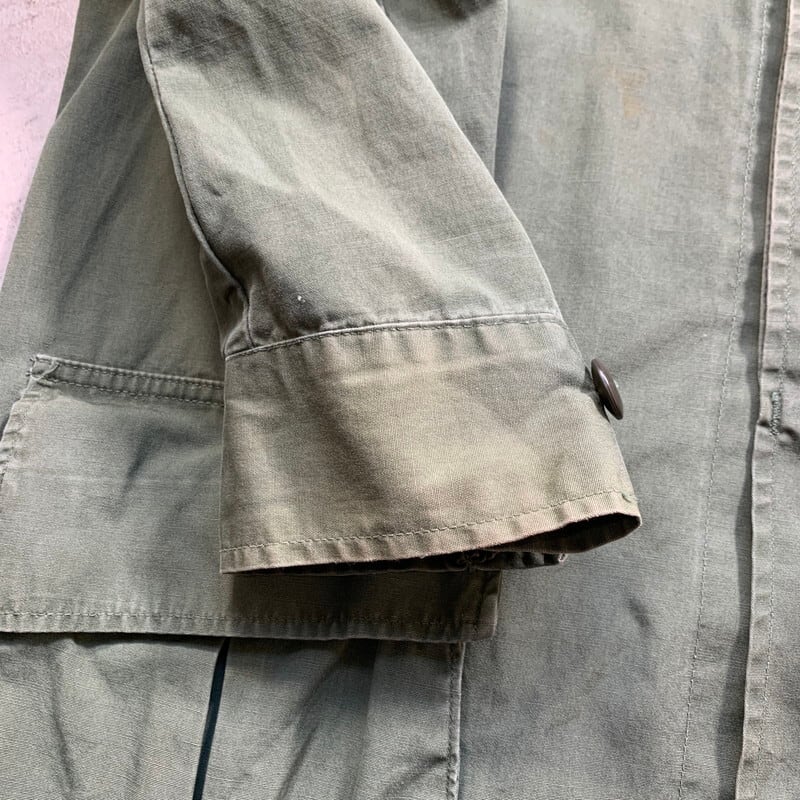 60年代のU.S.ARMYジャングルファティーグジャケットです。コントラクターはTELLICO MFG.CO、ミルスペックはDSA100-69-C-1404。同モデルの中では3rdタイプとして位置づけられているこちらは1st、2ndに見られるエポーレットは省略されたモデルです。通常3rdモデルではポケットの底の水抜き用のドレンホールが省略されていますが、こちらは69年度の3rdの最終モデルの為、ドレンホールが復活しております。4thと呼ばれるリップストップ地のモデルが68年頃から製造されている為、モデルチェンジの過渡期に作られたアイテムです。ボタンは全てオリジナルで揃っています。左下部のポケット横にダメージがあった為リペアしております。ポケットに小さな擦れがございます。右袖口に変色が見られますが比較的状態は良好と言える1着です。サイズはMEDIUM LONGですのでカバーオール感覚で羽織っていただけるサイズ感です。4th以前のノンリップ地は人気も高く年々枯渇していますので、お探しだった方は是非この機会にいかがでしょうか。