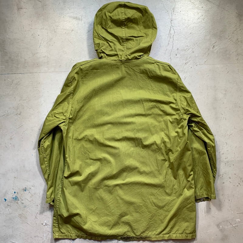 80年代のドイツ軍リバーシブルスノーカモパーカーです。雪山での装備を想定して作られている為本来はホワイトボディですが、オリーブカラーに後染されています。各国様々なスノーカモアイテムが存在しますが、ドイツ軍はその中でも特徴的なデザインのカモフラージュパターンが採用されています。左胸ポケット内にミルスペックラベルが縫い付けられています。フロントはOPTI社の回転式ジッパーで、リバーシブルで着用する事が出来ます。薄いシミは見られますが、使用感も少なくダメージは特にございません。サイズはGr.3で体感的にLARGE相当だと思います。発色の良いオリーブカラーですので、春先に使い易いアイテムでオススメです。