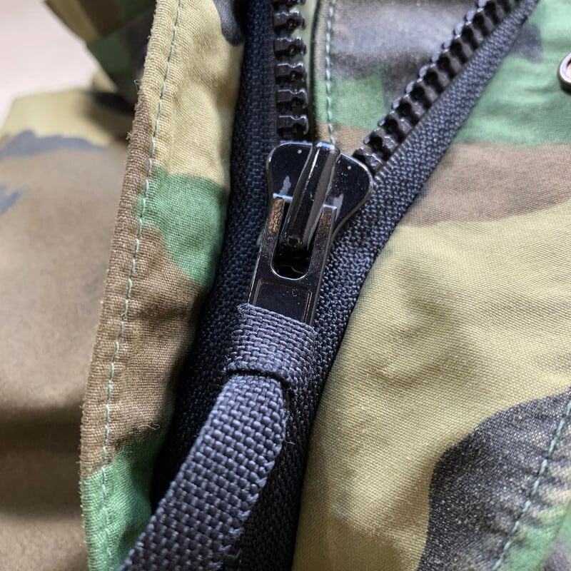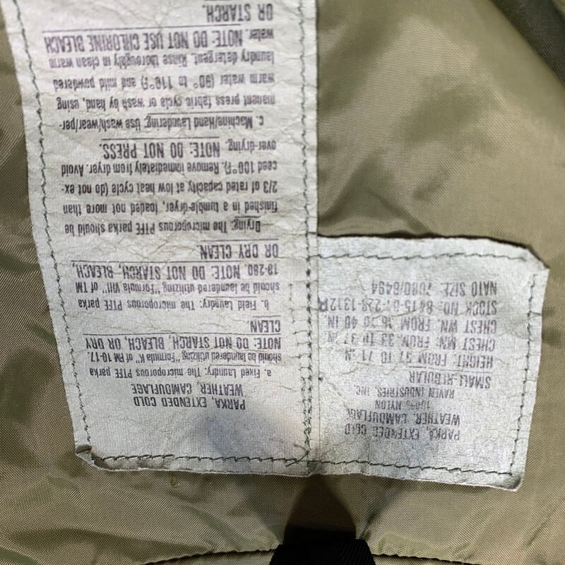 80年代頃のU.S.ARMY ECWCS GEN1ゴアテックスパーカーです。コントラクターはRAVEN INDUSTRIES社。ミルスペックは印字がありません。フードが一体型となる1st GENERATIONの前期型です。首元は高めに設計され、フードにスナップボタンは付きません。裾にドローコードが付くタイプです。前立てのステッチ幅も後期に比べ細めです。全体に色褪せが見られ、フードのライニングに擦れによるダメージがございます。ジッパー取っ手の欠損は無くその他は良好です。後期の物に比べ身幅もすっきりとしており、野暮ったい感じではないので着やすいと思います。ECWCSゴアテックスパーカーの中でも探しておられる方が多いSMALL REGULARです。GEN1前期も見つかりにくくなっていますので、お好きな方は是非いかがでしょうか。