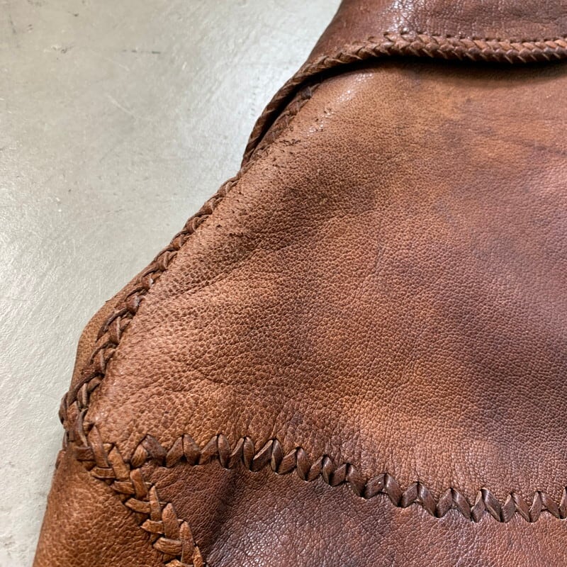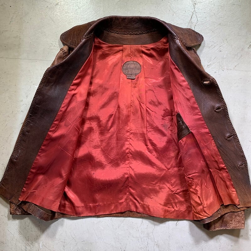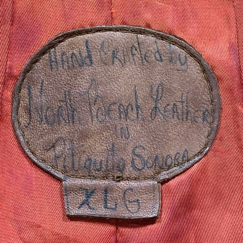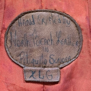 70年代頃のNorth Beach Leather クラフトレザージャケットです。1967年にアメリカサンフランシスコで設立されたレザーブランドです。70年代のヒッピーや、有名ロックミュージシャンも愛用するなど、クラフトレザー界では名の知れたブランドです。恐らくですが、ディアスキンが使用されており柔らかくしなやかです。エルビスプレスリーが着用していたジャケットに似たパターンでノースビーチの定番といえるデザインです。シミや擦れが見られますが、オイルメンテで少し綺麗になりました。レザーの包みボタンもすべてそろっています。ライニングの首タグ上部に小さなピンホールがございます。サイズはXL。この時代のジャケットは小さめで作られている事が多いので、こちらはゴールデンサイズと言えます。170cm70kgで丁度良いサイズ感です。やはりブーツカットデニムが抜群に相性が良いですが、ワークウェア等と合わせても渋い雰囲気が出せますので、お好きな方は是非いかがでしょうか。