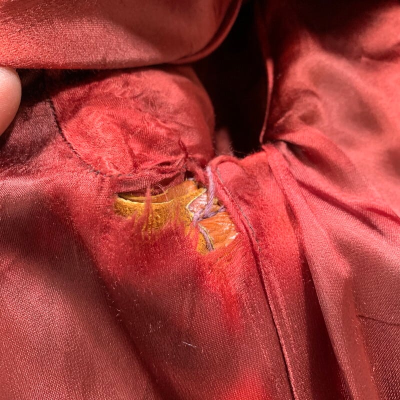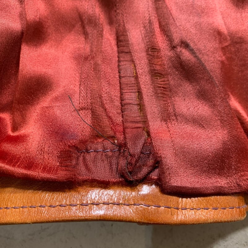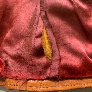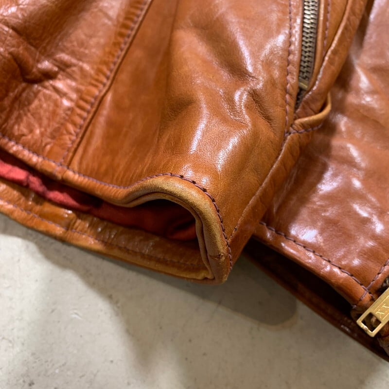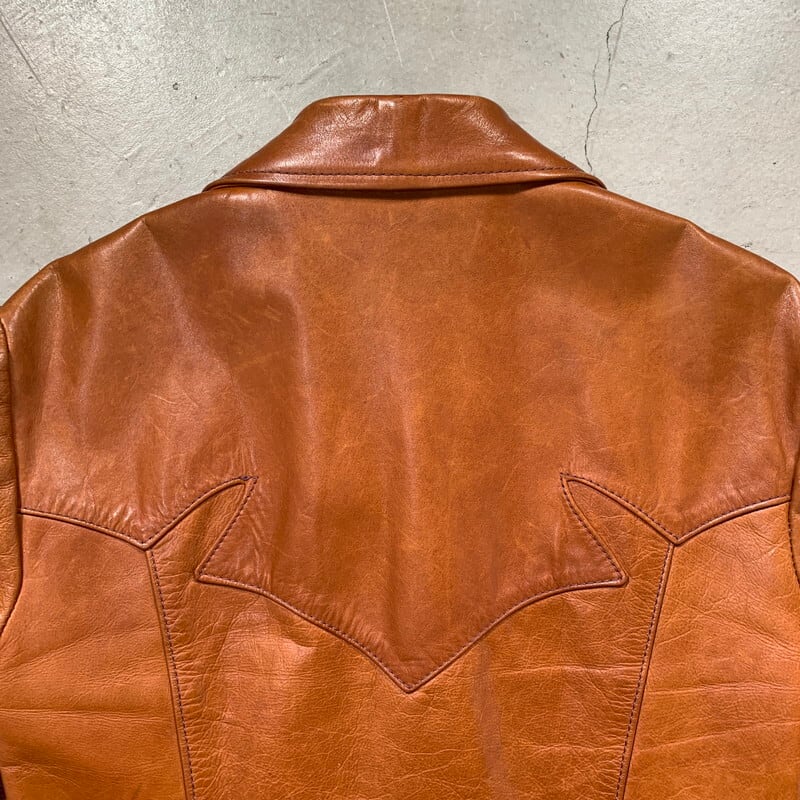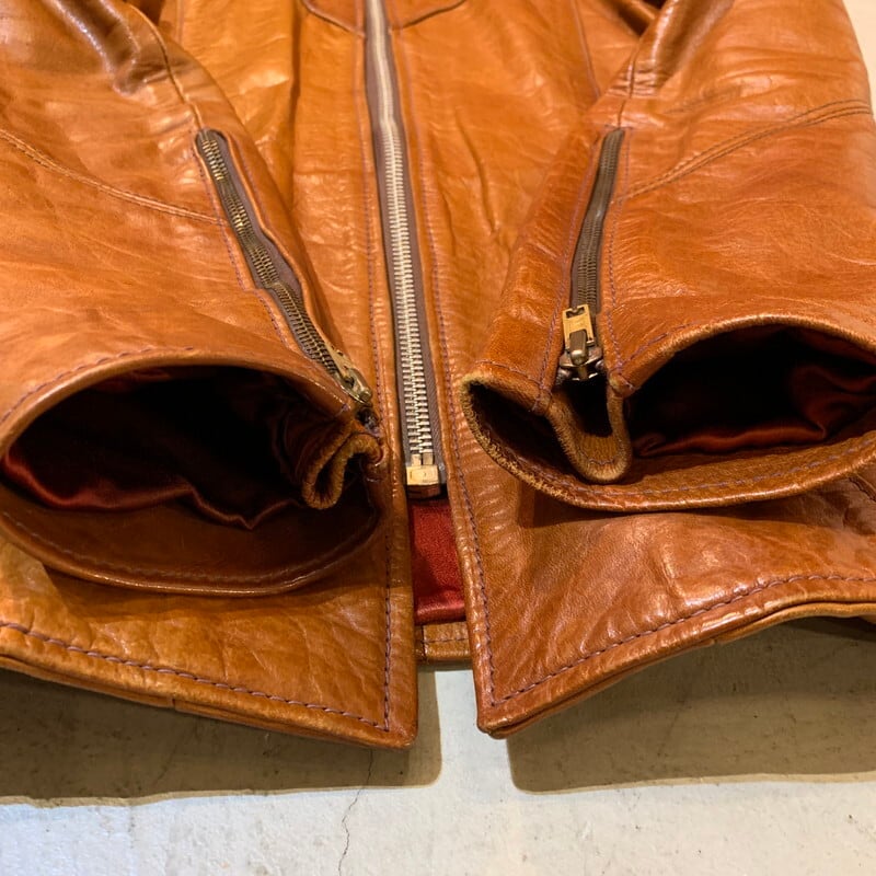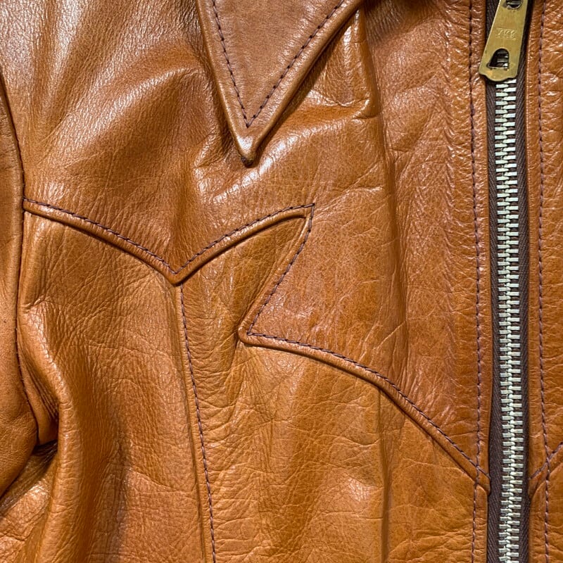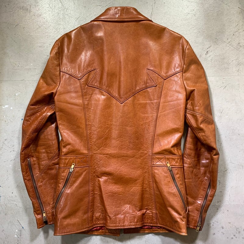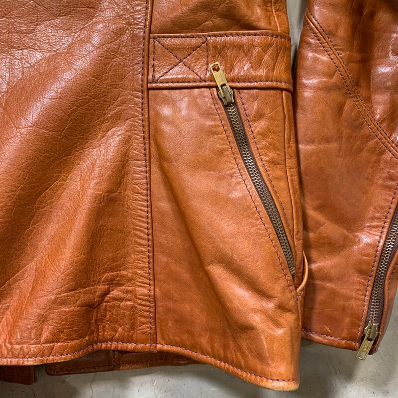 70年代頃のEast West Musical Instruments "Sun Dance"クラフトレザージャケットです。1967年にサンフランシスコで設立された言わずと知れたブランドです。設立当初は楽器制作会社であった為、ブランド名に Musical Instrumentsというワードが入ります。ハリウッドスターやミュージシャンに愛され、現在もコレクターが多く存在しています。今回ご紹介するアイテムはSun Danceというモデルで、ヨークのデザインが特徴的な1着です。ハンドポケットと、サイドバックにもジッパーポケットが付きます(スタッシュポケットの役割かは不明です)。張りのある上質なレザーを使用していて非常に綺麗なシルエットです。YKKのブラスジッパーが使用されています。袖先にやや擦れはありますが、美品です。ライニングの付くタイプで、一部破れがございますが簡単なリペアで修復可能かと思います。サイズは42。元々タイト目な作りですので、良い塩梅のサイズ感で着ていただけるのではないでしょうか。ライニングのダメージ以外はミントコンディションと言っても過言ではない素晴らしい状態です。70年代頃のヒッピーカルチャーに興味のある方、クラフトレザーがお好きな方やコレクターの方は是非いかがでしょうか。