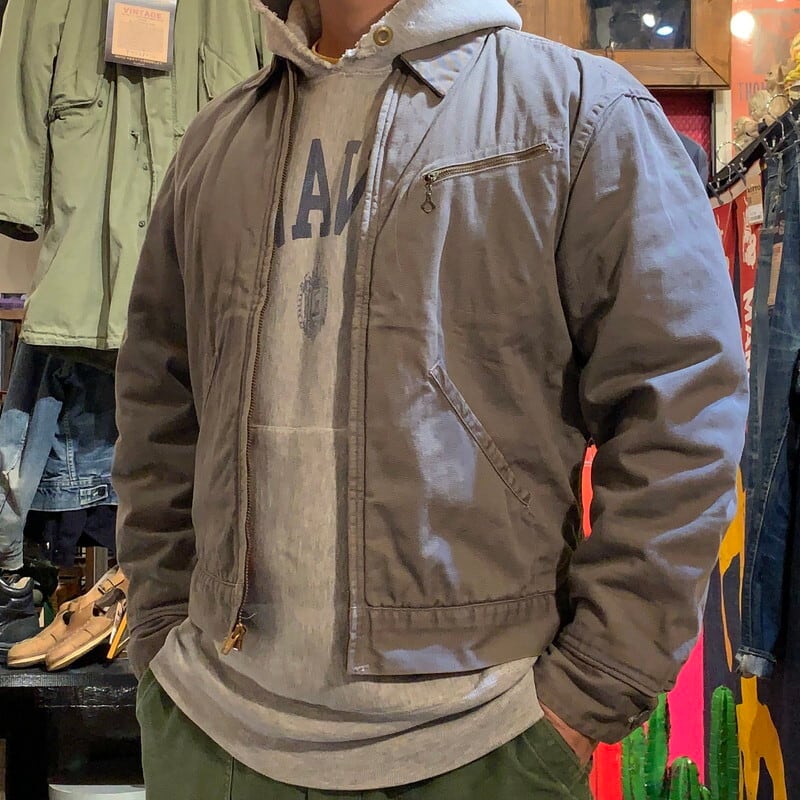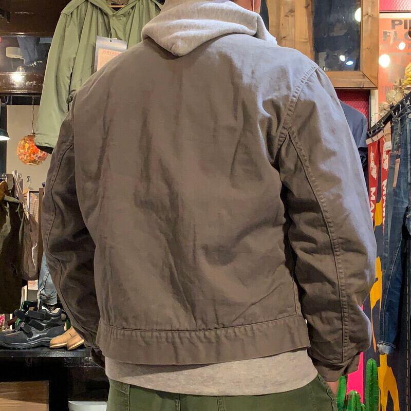 50年代頃のBIG BENキルティングライナーワークジャケットです。1915年に創業した後にBLUE BELL社と合併した歴史のあるワークブランドです。ボディはコットンツイルで、ライニングはサテンのキルティングです。ひし形では無くジグザグに縫製されたライニングが特徴です。gフロントはブラスのTALON,胸元はCONMARのチェーンジッパーが使用されています。当時BLUE BELL製品と同様の生産ラインで作られていた為タグの付け替えが安易なシールタグが採用されていたようです。シールタグは欠損している物が多いですが、奇跡的に残っています。肩周りにヤケがあり全体に薄汚れがございます。ダメージは特にございません。サイズは40。170cm70kgのスタッフで、インナーにリバースウィーブのパーカーを着てびったりジャストですが、肩周りが少し窮屈に感じます。シンプルなデザインですので、コーディネートの幅も広く使い勝手の良いアイテムです。