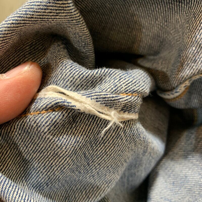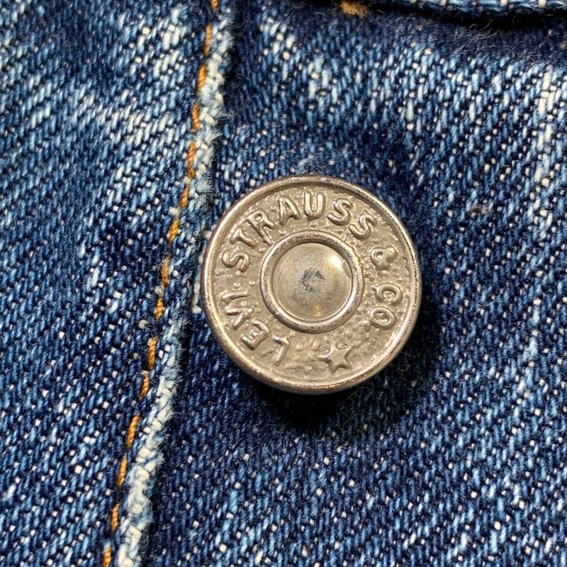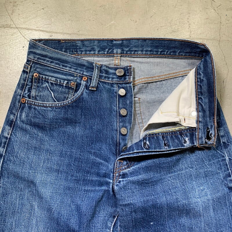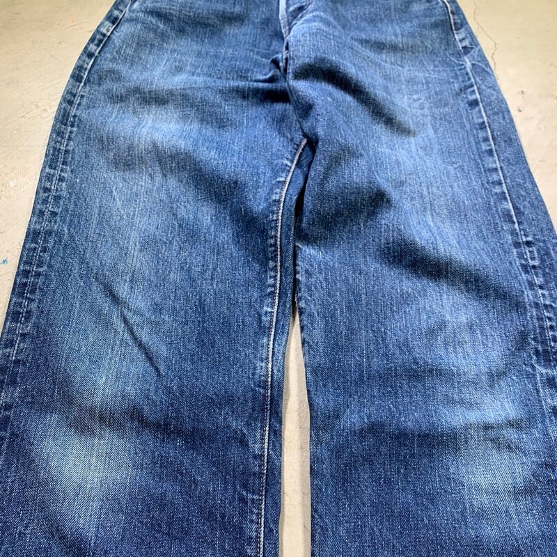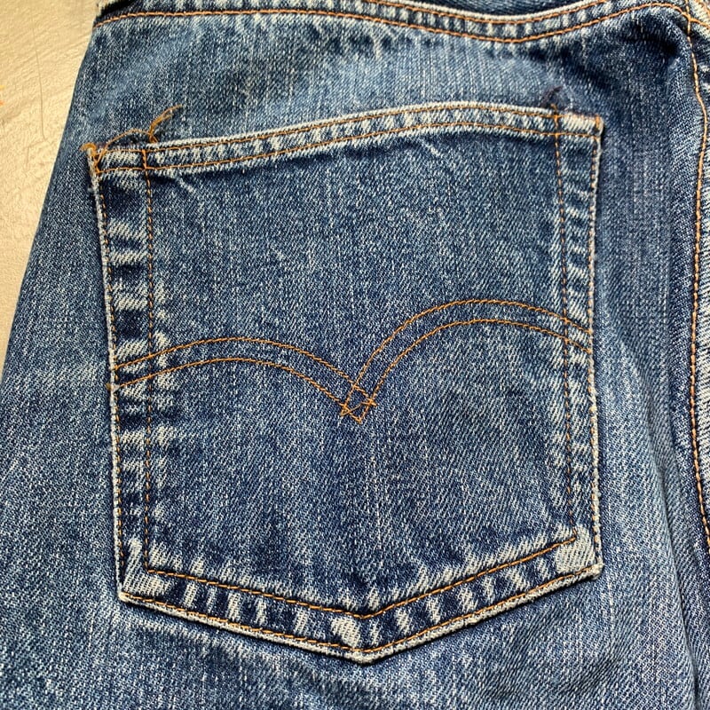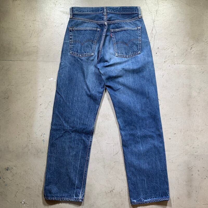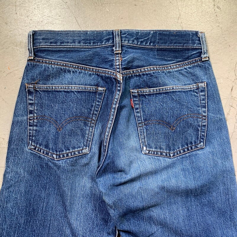 60年代70年代頃のLEVI'S 501デニムBig Eモデルです。トップボタン裏刻印6、平行ステッチ、フライボタン足長R、ウォッチポケットチェーン、セルヴィッジ裏両面シングル、バックポケット裏シングル、Big E、不均等V。バランスの良い縦落ちで、色残りは5割ほど残っています。裾、内股に擦れ、右ポケットスレーキに小さなダメージ、ボタンホールに補強が見られますが、大きなダメージやリペアの無いグッドコンディションです。サイズがやや小さめで、実寸約W29インチです。細身の方や女性にもお勧めしたいサイズ感です。これからの季節にぴったりな1本です。ヴィンテージリーバイスの人気も高く今後価値が下がる事のないアイテムですので、サイズが合う方は是非いかがでしょうか。