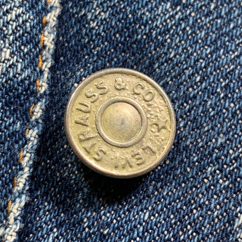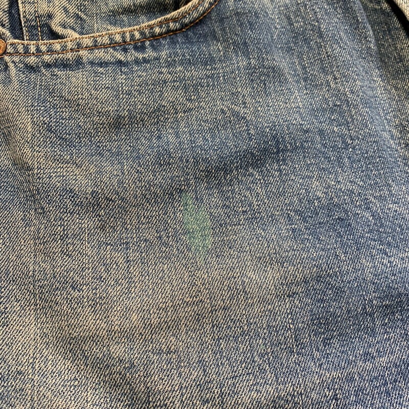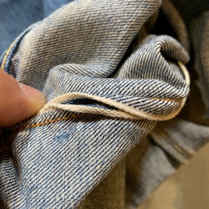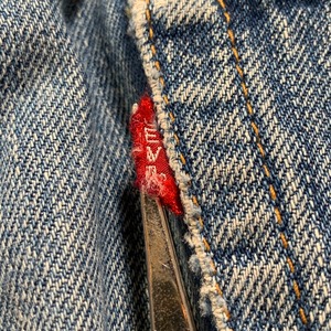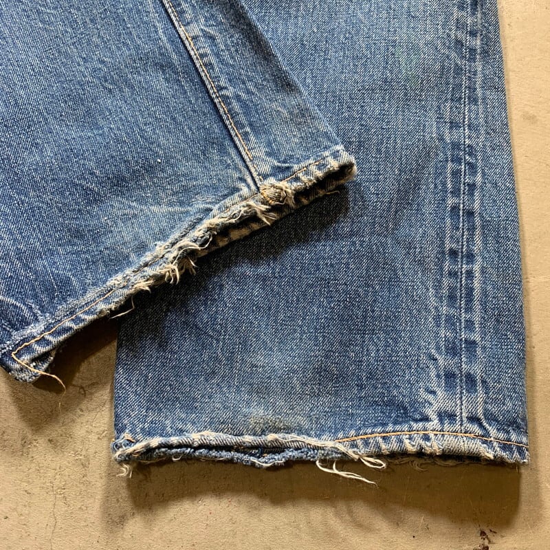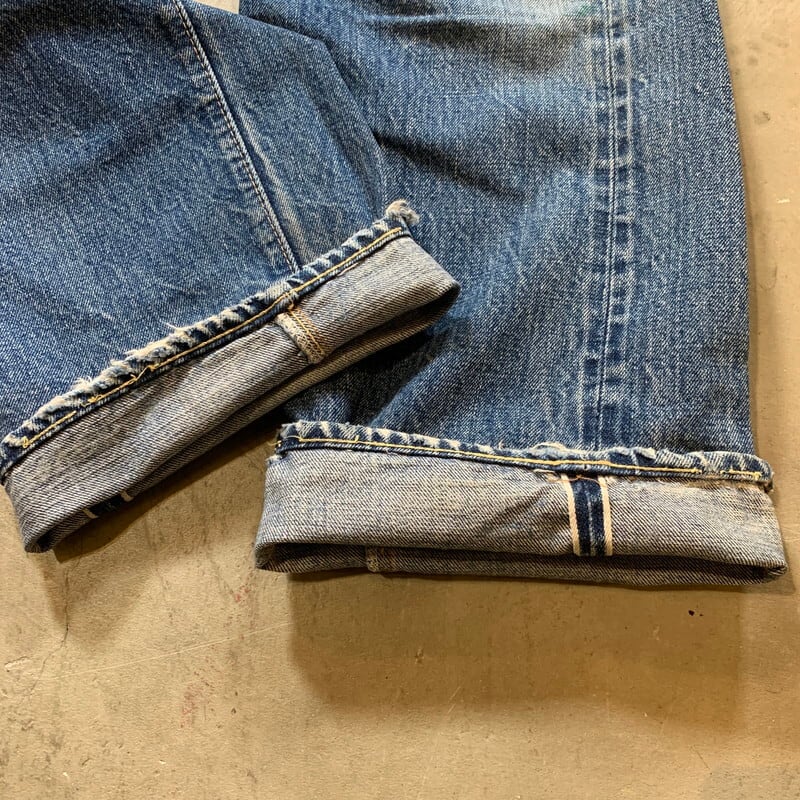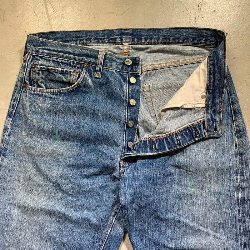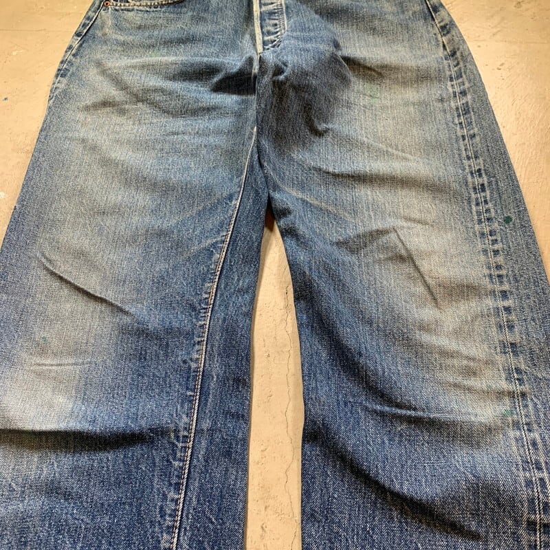 60年代から70年代頃のLEVI'S 501デニムBig Eモデルです。トップボタン裏刻印4、平行ステッチ、フライボタン足長R、ウォッチポケットチェーン、セルヴィッジ裏両面シングル、バックポケット裏シングル、Big E、不均等V。全体に色落ちしており、色残りは4割程度。うっすらとヒゲの残る1本。グリーン系のペンキが飛んでおり、ヴィンテージデニムらしい雰囲気です。右ベルトループにほつけがあり、裾は擦れによるダメージがございます。その他はリペア無しで、比較的良好なコンディションです。サイズも実寸約W34インチとお探しの方も多いゴールデンサイズです。ヴィンテージリーバイスの人気も高く今後価値が下がる事のないアイテムですので、サイズが合う方は是非いかがでしょうか。