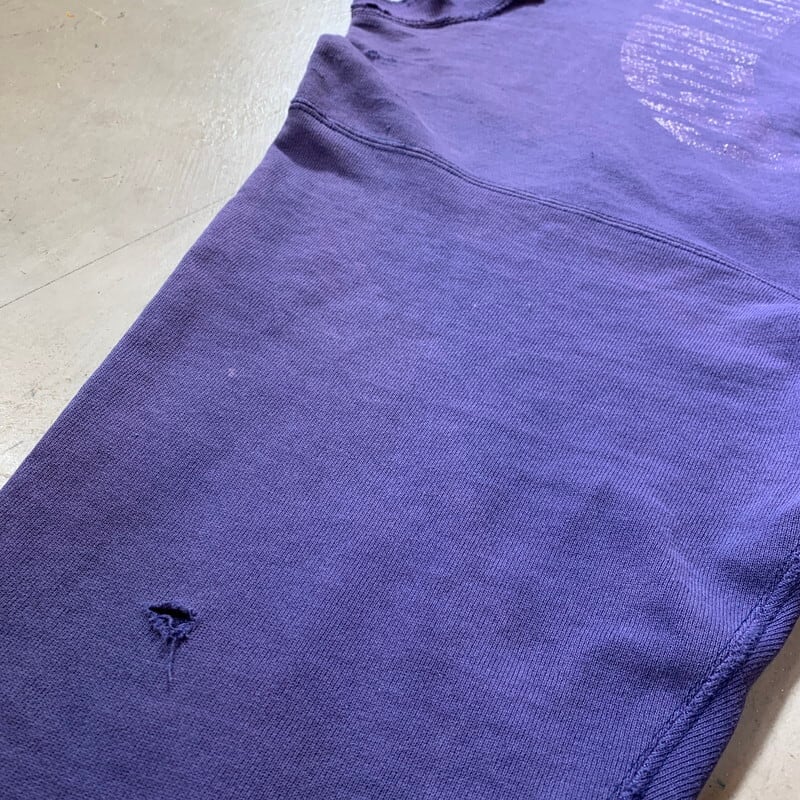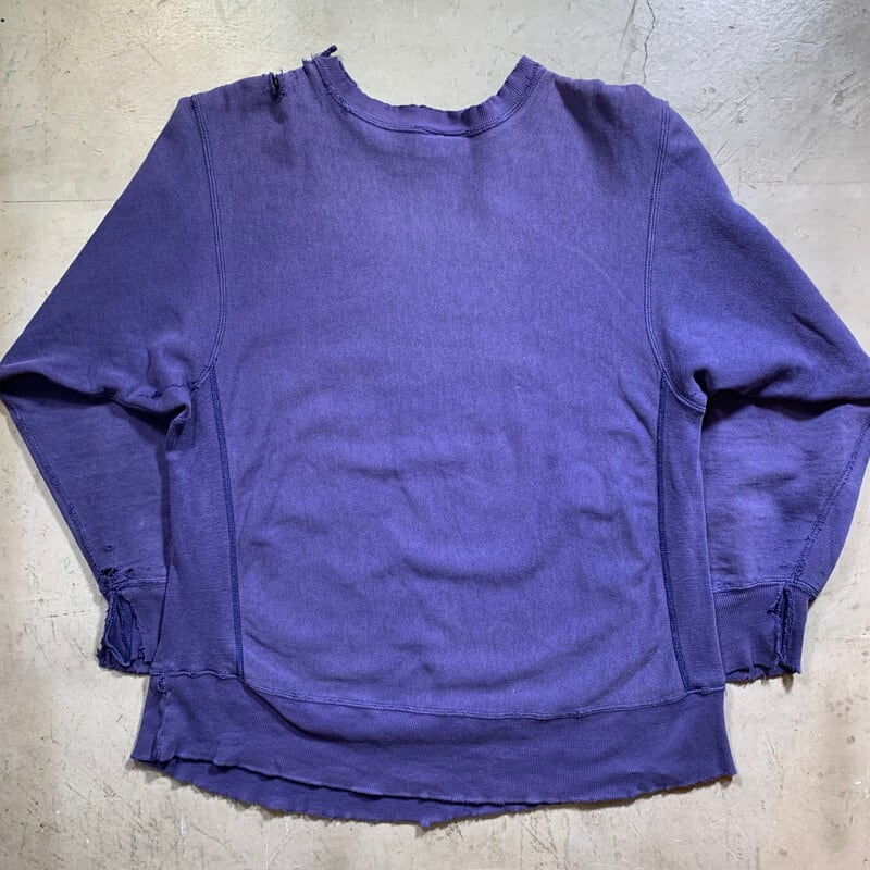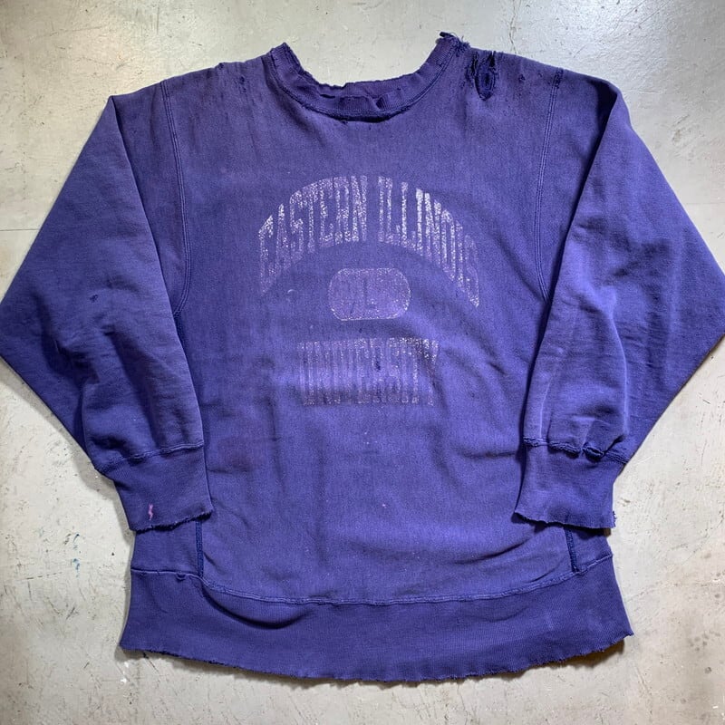 80年代のChampionリバースウィーブスエットです。首タグが欠損していますがカレッジ物に付くことが多い2枚タグが付くトリコタグがついていたと思われます。EASTERN ILLINOIS UNIV.は1895年にイリノイ州チャールストンで設立された大学です。フロントは人気のカプセル3段プリントですが、プリントの9割以上が剥げています。肩周りや袖にダメージがあり、シミなど全体に使用感強めです。ボディはナス紺のようなパープルで、色の褪せ方は秀逸な1着です。コンディションの良いリバースはもちろん良いですが、このようなダメージが強くグランジ感あふれる個体は人気も高く、有名アーティストもボロボロのリバースを着用するなど注目されています。加工では出せないアートピースな雰囲気が堪りません。綺麗目なスタイルのハズシにいかがでしょうか。サイズはXL相当です。