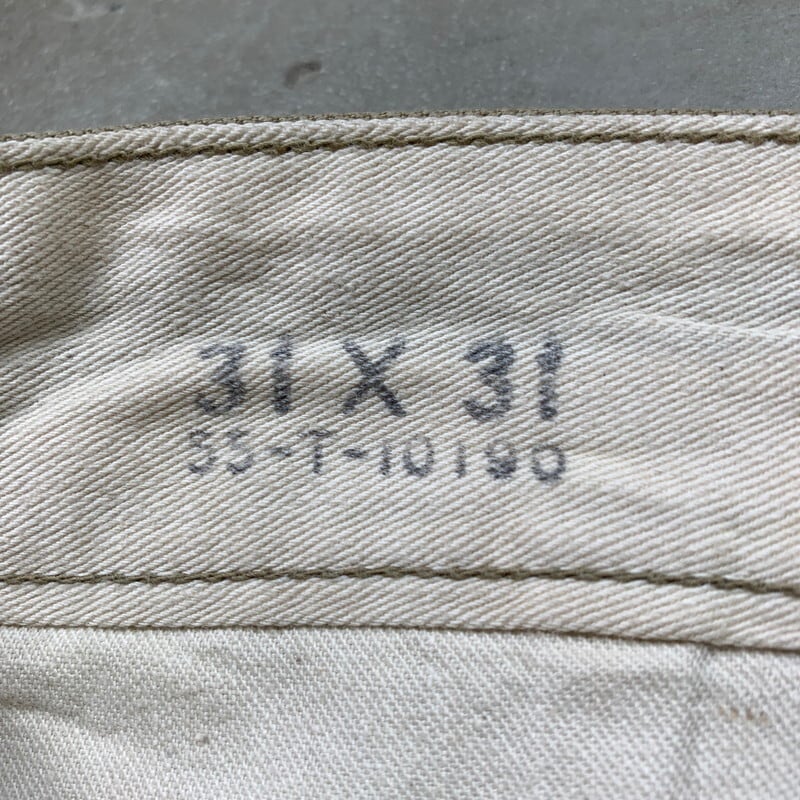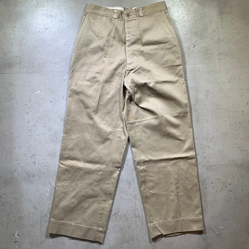 50年代初頭のU.S.ARMY チノトラウザーズです。MIL-T-2064B。M-1945KHAKIと呼ばれるモデルの後継タイプです。フロント尿素ボタン、ポケット淵は両玉縁では無くなり、フロントポケットも45カーキに比べ角度もまっすぐに近い縫製です。アウトシームシングルステッチ。ベルトループは幅の太いタイプ。スレーキ裏のミルスペックもしっかりと確認出来ます。使用感も少なく生地はしっかりと張りが有りグッドコンディションといえます。右腿付近に1箇所小さなダメージがありましたので、リペアしています。1952年から1954年頃のモデルとされる2064-Bも先日オンラインに載せた2064-Aの45KHAKI同様に年々見つかりづらくなっています。表記W31ですが実寸W30位です。ミリタリーチノをお探しだった方は是非この機会にいかがでしょうか。※レングスは5cm程伸ばせます。