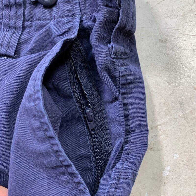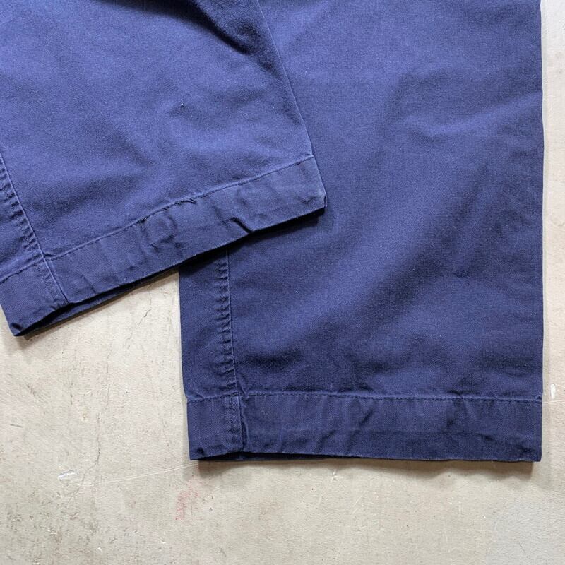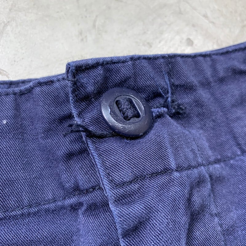 イギリス海軍、ROYAL NAVYコンバットパンツです。イギリスの海軍で使用されていたとされるこちらは、サイドの斜めについたポケットが特徴で、マチも深さも十分に有る大容量ポケットです。フロントにタックが入り、ワタリ幅はゆったりとしていながらテーパードの利いた綺麗なシルエットです。左ハンドポケット内側にはジッパーポケットも内蔵されていますので、小銭等も分けて収納できます。ウエストのアジャスターはゴムになっているので、ストレス無く着用できます。詳しい年代は不明ですが、生産国は不明ですが、COLUMBIA製かCHINA製の2000年代のアイテムだと思われます。バックヨークにハンドリペアがございますが、あまり目立ちません。USミリタリーに比べどこか上品な印象もあり、綺麗目なコーディネートでもあわせることがし易い為、大変人気のあるアイテムです。サイズ表記は88で、実寸はW34くらい。白シャツで爽やかに合わせてみてはいかがでしょうか。