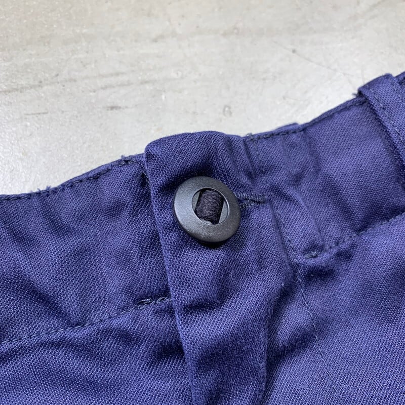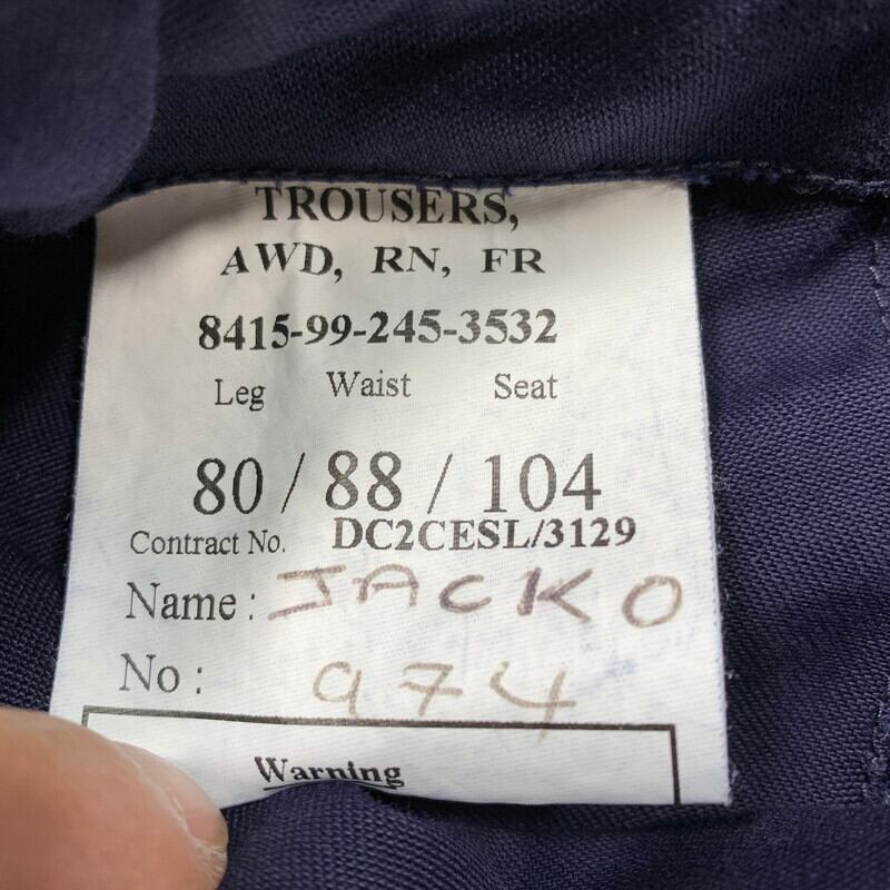 イギリス海軍、ROYAL NAVYカーゴパンツです。潜水艦の乗務員たちが使用していたとされる作業用のワークパンツです。フロントにはタックが入り、サイドにアジャストボタンが付きます(こちらはゴム仕様ではありません)。コンバットパンツに比べ肉厚でコットンツイルのような生地感です。U.S.ARMYのカーゴパンツに比べテーパードが入る事で非常に綺麗なシルエットとなっています。こちらも年代は古い物ではございませんが、人気の高いアイテムです。フロントに小さなペンキ飛びはございますが、ダメージの無いグッドコンディションです。サイズ表記は88で、インチですとW34相当です。綺麗目なコーディネートがお好きな方にはお勧めしたいアイテムです。