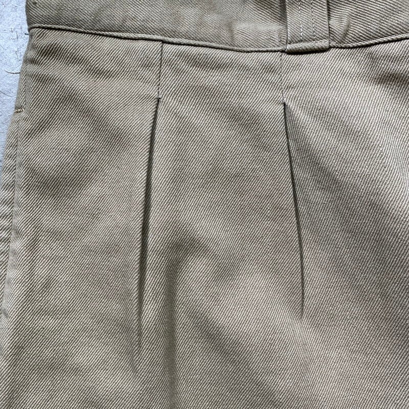 50年代から60年代頃のフランス軍M52チノトラウザーズです。しっかりとした厚手のコットンチノを使用しています。フロントはボタンフライでウエストに2タックが入ります。腰周りからワタリにかけゆったりとしたシルエットで、テーパードが入る事ですっきりとした印象で着用していただけます。お尻付近にヤケのような薄い変色がございます。多少の使用感はございますが、特筆するダメージなど無く良好です。表記は35で「3」はレングス「5」はウエストサイズを表しています。インチでいうとW35~36相当です。最近では後染めされた製品も人気がございますが、オリジナルのベージュのチノはスタイルを選ばず幅広く使えますのでお勧めなアイテムです。
