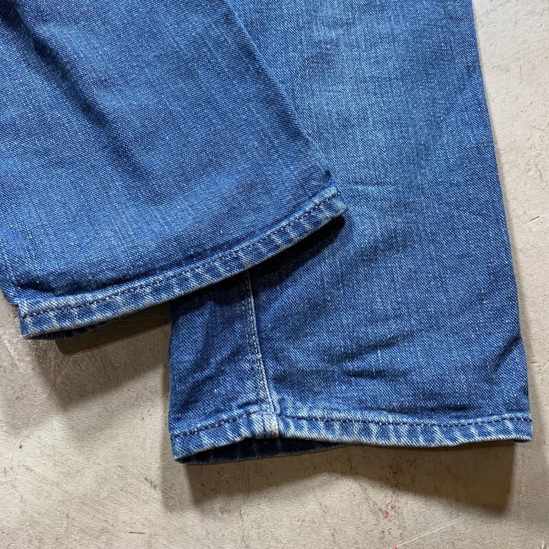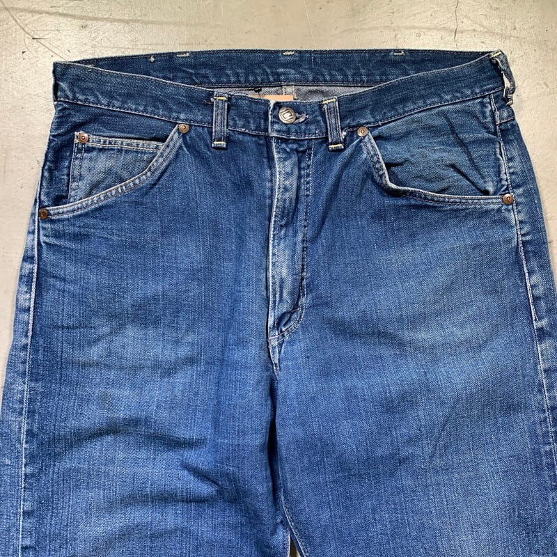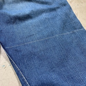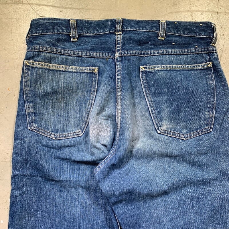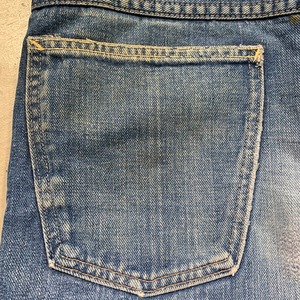 60年代頃のPOWR HOUSE101デニムジャケットです。1872年シカゴで創業したMONTGOMERY WARDが展開していたプライベートブランドです。ワークウェアラインのPOWR HOUSEから派生しウェスタンウェアを手掛けた101シリーズのアイテムです。トップボタンに101刻印、TALONのセミオートマチックジッパー、リベットにも101刻印有り。アウトシームは片耳仕様です。全体に程よく色落ちし、縦落ちが綺麗な1本です。裾に向かってテーパードが強く入ります。リーバイスでいうところの606のようなシルエットです。右膝にブリーチ抜けと小さなダメージがございます。お尻箇所に1箇所リペアがございます。右太もも背面に1直線に糸抜けによるラインがございます。生地はしっかりとしており、色具合もこれからの季節にぴったりです。ウエストはW34インチ位で良いサイズです。ストアブランドの耳付きデニムは今のうちに手に入れておいた方が良いかもしれません。お探しだった方は是非いかがでしょうか。