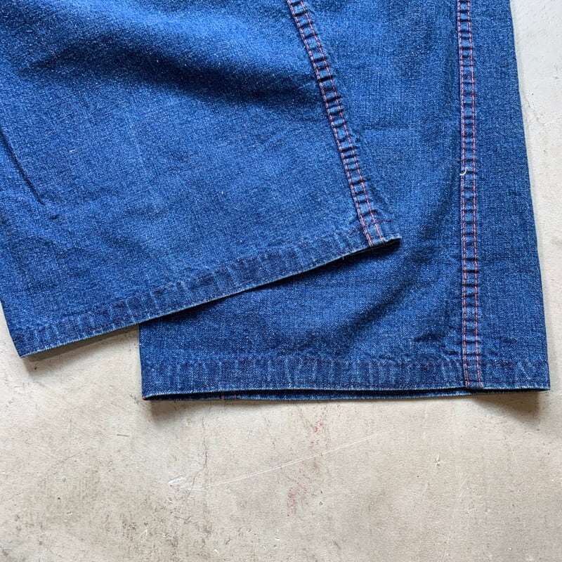 60年代70年代Unknownライトデニムバギーパンツです。内側にサイズが印字されたタグが付きますが、メーカーは不明です。ランチパンツに少し似たデザインです。サイドとバックにはポケットは無くジッパーとベルトループのみの非常にシンプルな1本です。DOVEのアルミピンロックジッパーが使用されています。トップは猫目ボタンに変更されています。ズドンとしたストレートでゆったりとしているので、ペインターパンツに近い感覚で穿いていただけます。色も比較的濃いめに残っていますのでこれからガンガン穿いて育ててみてはいかがでしょうか。ウエストはW32インチとゴールデンサイズです。
