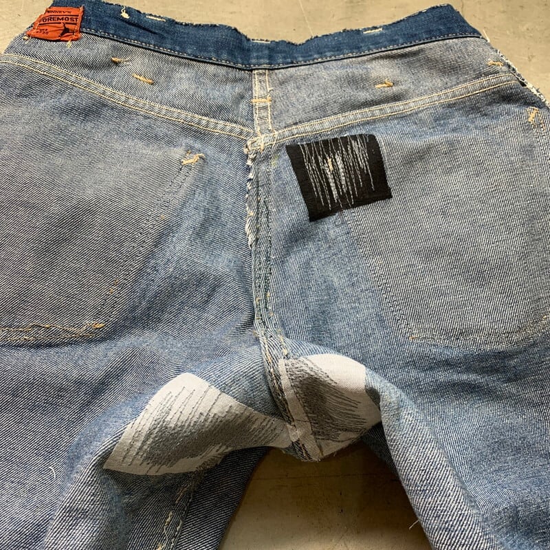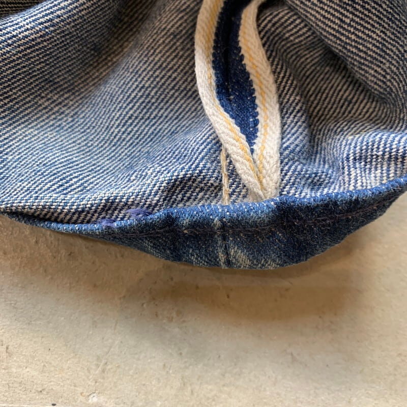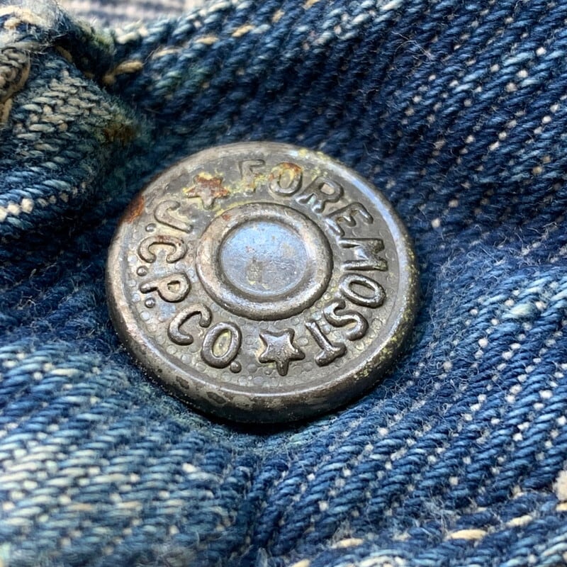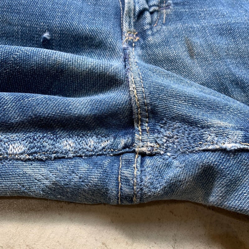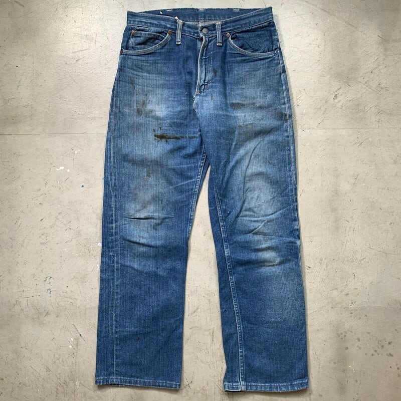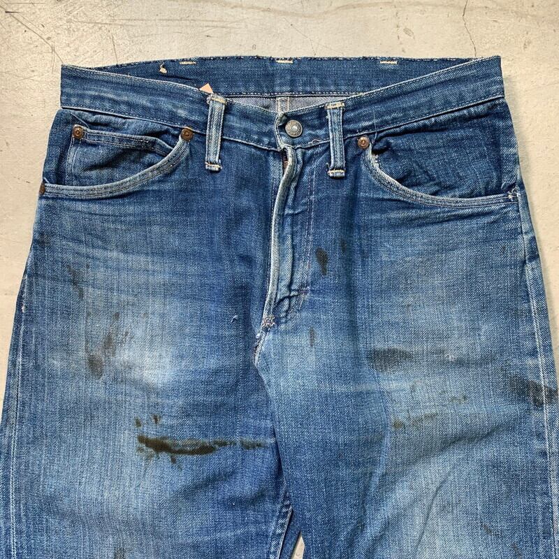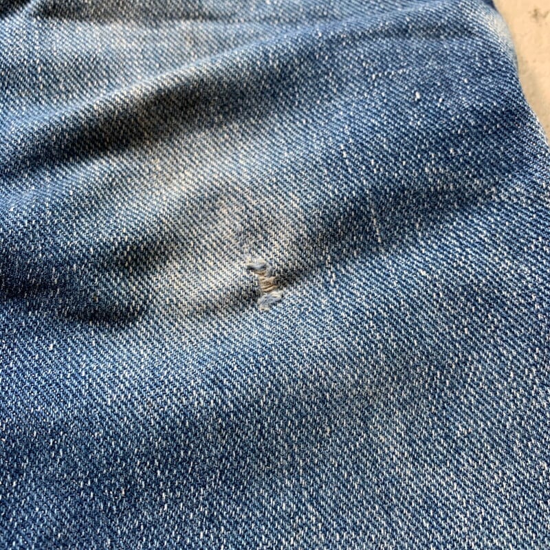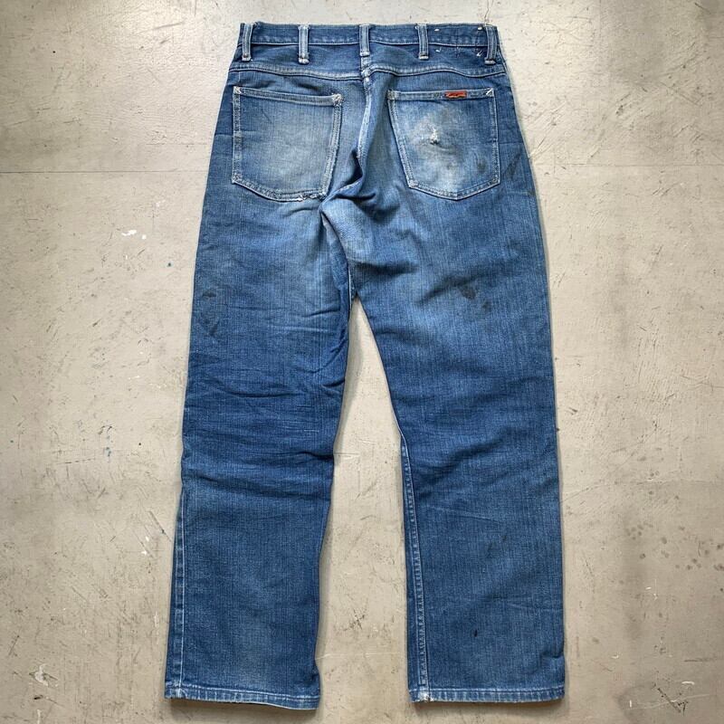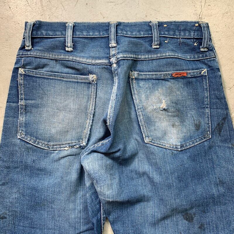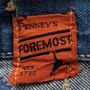 60年代頃のFOREMOST 5Pデニムパンツです。アメリカ3大ストアとして有名なJCPennyのオリジナルラインでウェスタンウェアを手がけていたブランドです。トップはブランドネームのスナップボタンで、GRIPPER社のカムロックジッパーが採用されています。両腿にシミが汚れがございます。股付近とバックポケットにリペアがございます。その他ややダメージはあるもののワークウェアらしい良い雰囲気の1本です。ストア物ではなかなか見つからない両耳のセルヴィッジが使用されていてロールアップでも映えるのが嬉しいポイントです。左足のセルヴィッジだけねじれてます。ストア物のデニムパンツも王道のリーバイス等に比べると数も少なく年々希少性も高まっていますので、サイズの合う方には是非お勧めしたいアイテムです。