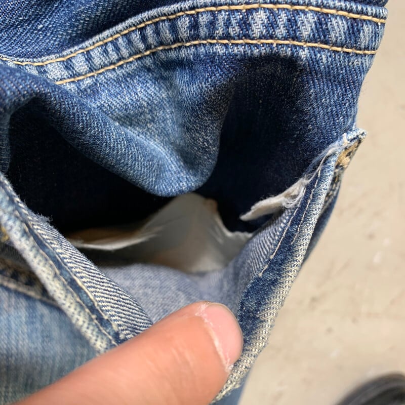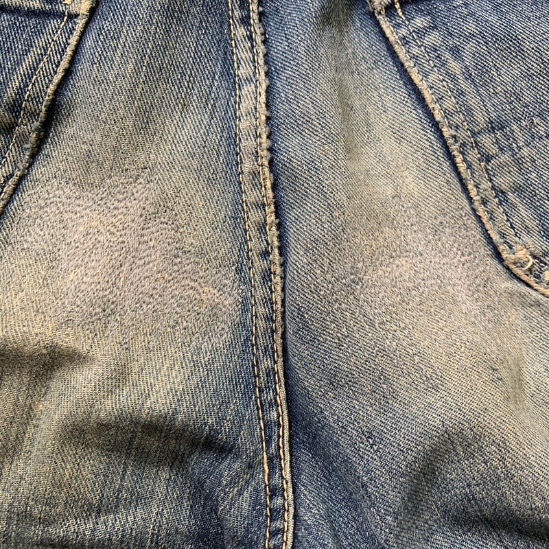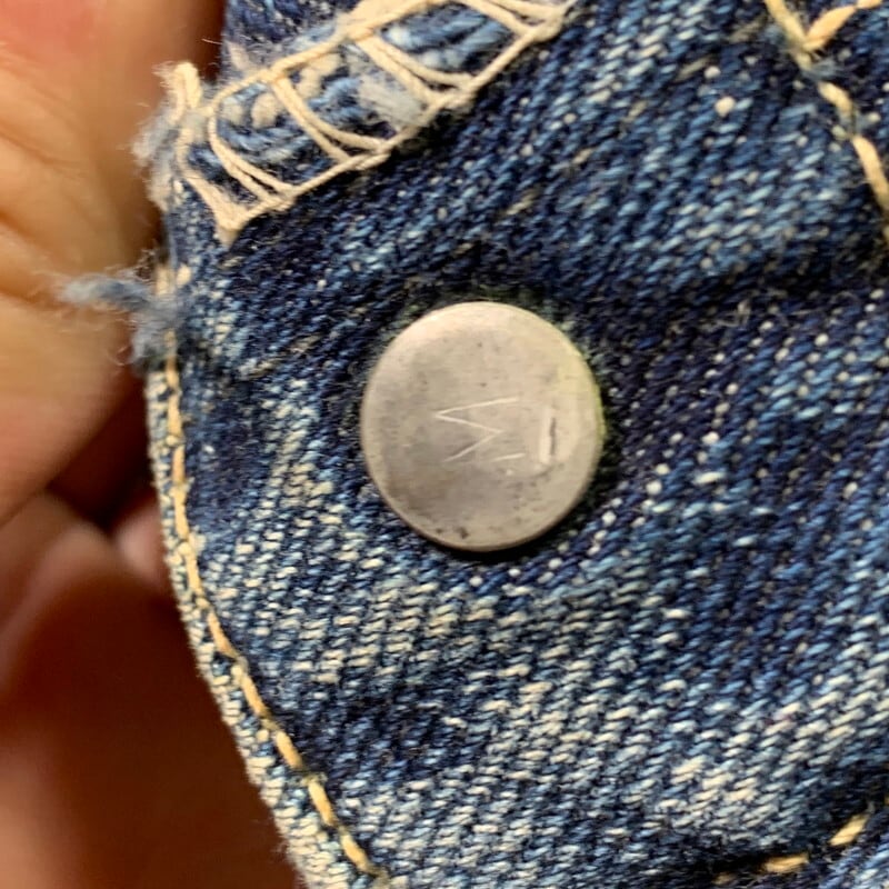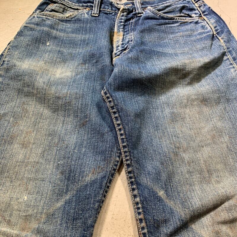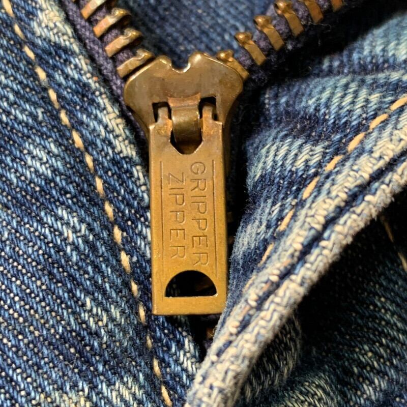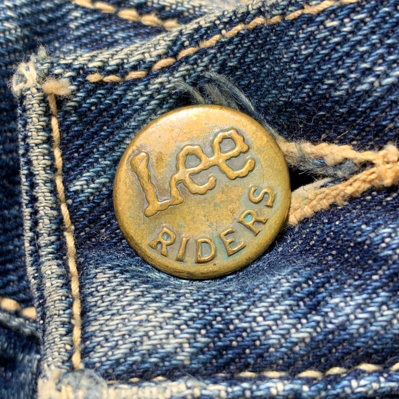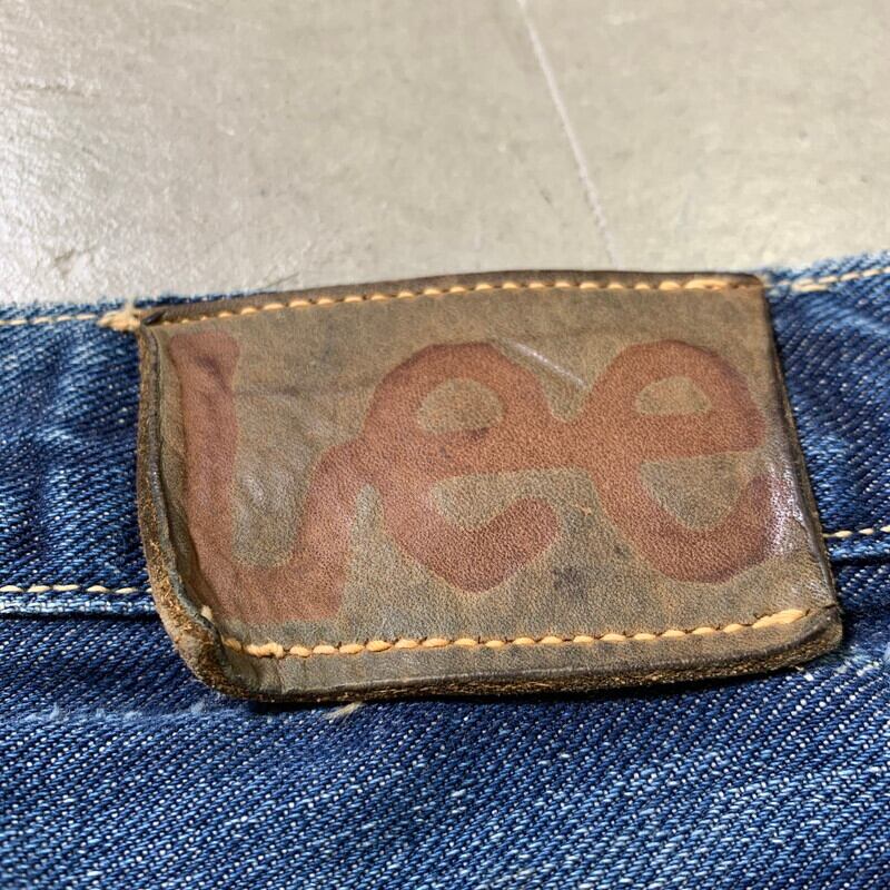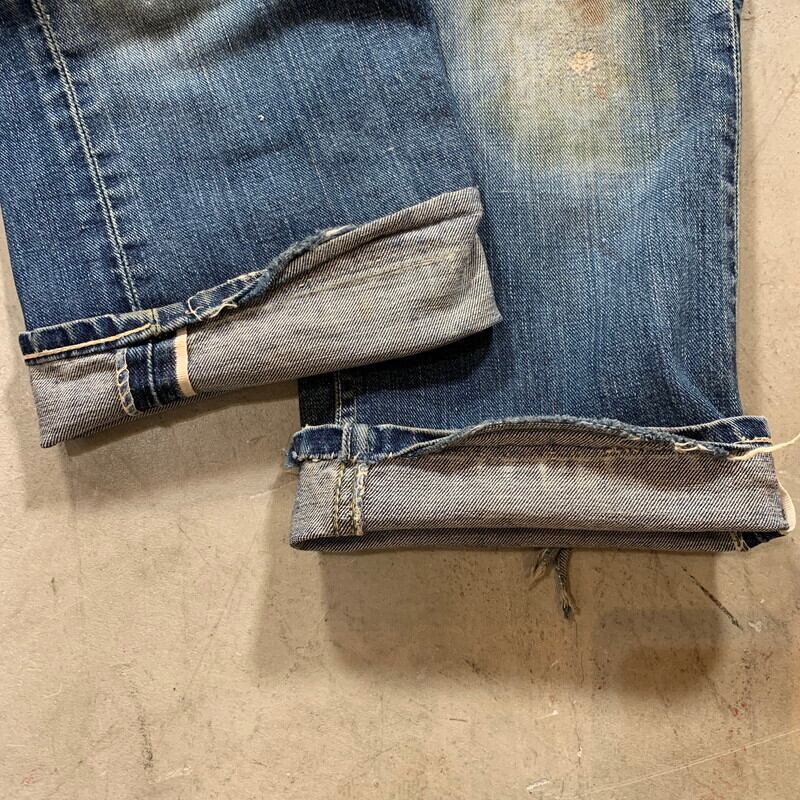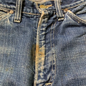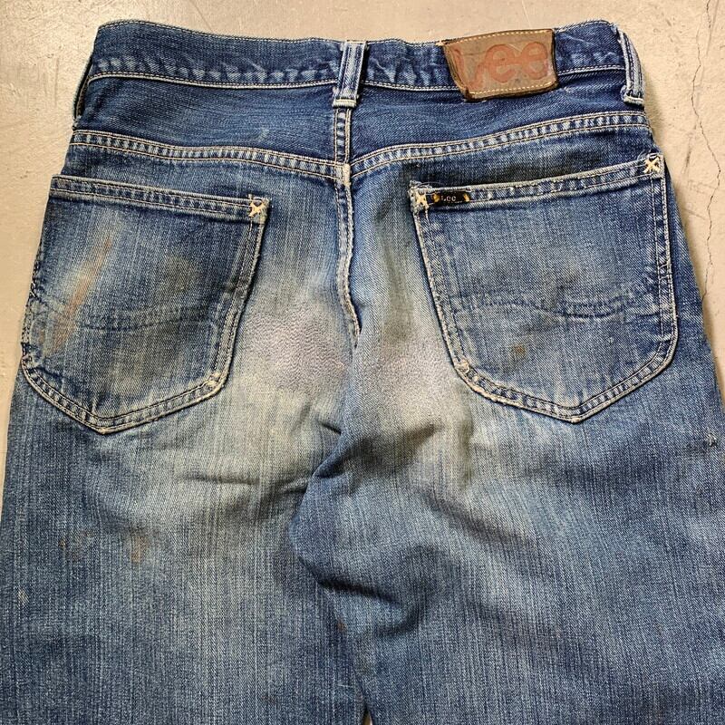 1950年代のLee 101B RIDERS デニムです。50年代初頭にLee COWBOYから、Lee RIDERSへとモデル名が変更されたモデルです。トップボタンにはライダースの文字、ジッパーはGRIPPER ZIPPERのピンロックが使用されています。ウエストには赤タグから移行し短期間のみ使用されたセンター黒タグが付きます。アウトシームは片耳仕様です。バックポケットのピスネームには®マークが入りMRはございません。両膝とお尻にリペアが有り、裾にはダメージがございます。縦落ちした色味にシミや汚れが相まってヴィンテージデニムらしい表情の1本です。アウトシームは片耳仕様なのでロールアップにも向いてます。ダメージや汚れなど雰囲気系なヴィンテージデニムがお好きな方は是非いかがでしょうか。ウエストはW29インチでやや小さめです。細身な男性や女性にお勧めです。バンドTeeと合わせるととてもかっこよいアイテムです。
