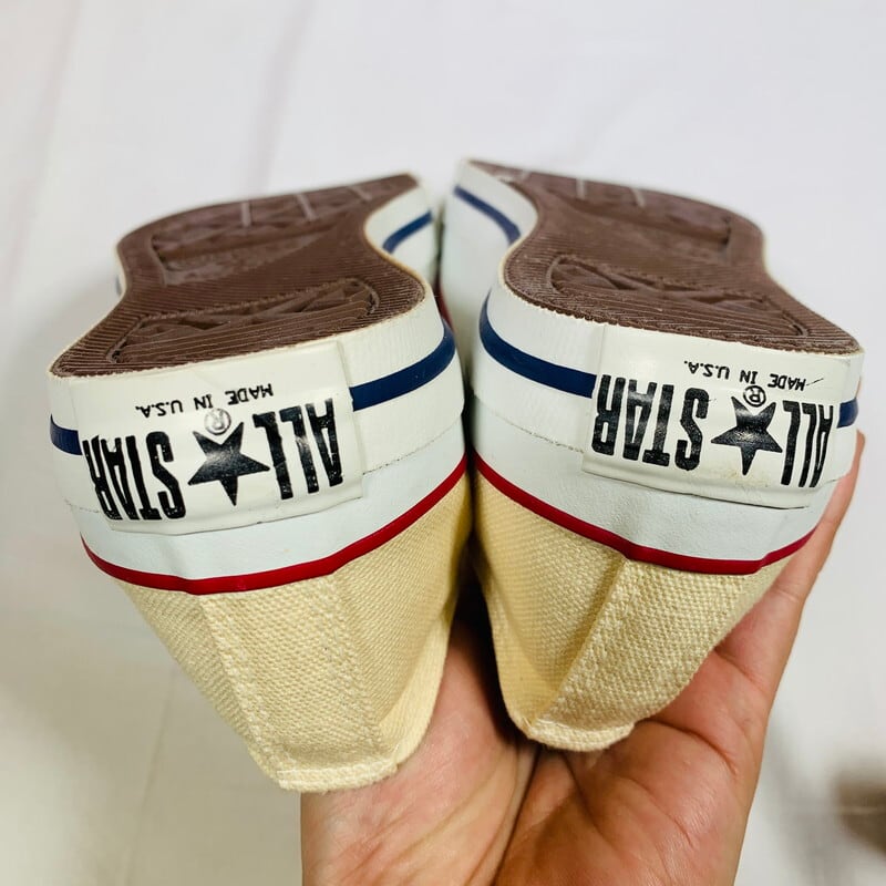 90年代後期のコンバースオールスターLOWです。希少な箱付きデッドストックです。2000年代初頭にUSAコンバースが倒産し、以降USA製コンバースは年々価格も高騰しております。定番のオフホワイトはスタイルを選ばず幅広いコーディネートに使えます。サイズはUS7(25.5cm)とメンズではやや小さいサイズです。足の小さい方や、女性の方にデカ履きで合わせて頂いても良いかも知れません。USA製は今後さらに入手が難しくなると思われますので、是非今のうちにゲットしてみてはいかがでしょうか。