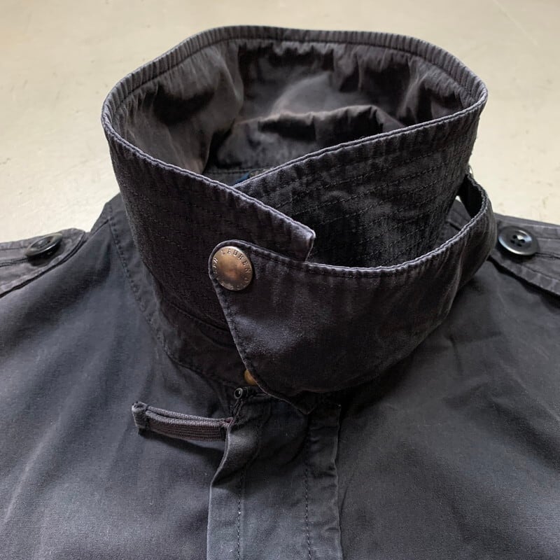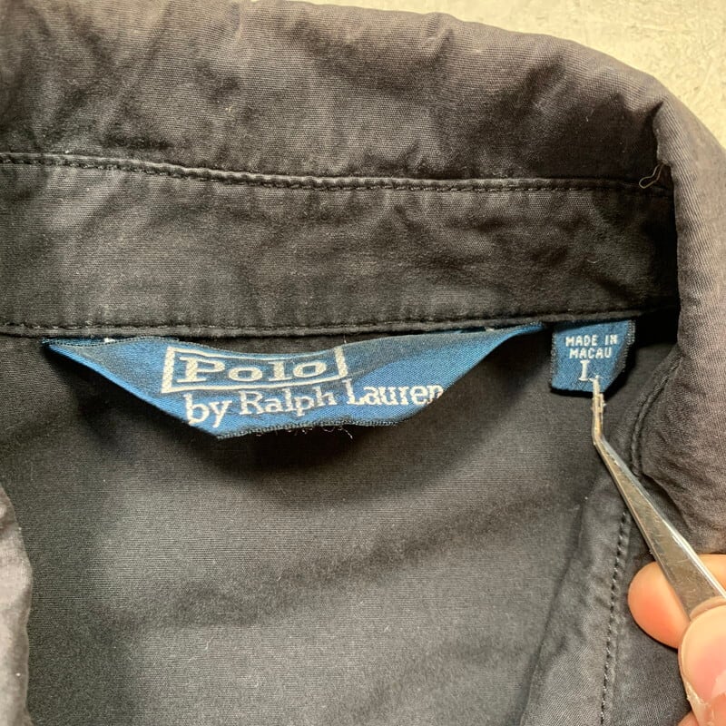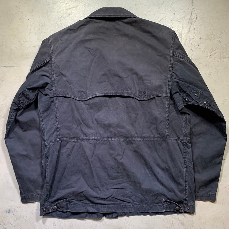 Polo by Ralph Laurenのコットンハンティングジャケットです。元々は濃いブラックのボディですが、着古したヴィンテージウェアを彷彿とさせる墨黒カラーが非常に渋い1着です。数多くのミリタリーやハンティングウェアを作り続けているラルフローレンですが、今回ご紹介のこちらのジャケットは、ミリタリーとハンティング、モーターサイクルジャケットをミックスしたような非常に珍しいデザインです。2段階式のドレンホール付きのマチポケットやエポーレット、斜めに配置されたハンドウォーマーポケット等興味深いディティールがてんこ盛りです。襟元のチンストラップも古いフィールドジャケットの様でもあります。袖口や襟に擦れや色褪せはございますが、全体の雰囲気にマッチしたコンディションなので、かえって良いアが出ています。サイズはLで、ライニングの付かないタイプですのでこれからの季節でも使い易いアイテムです。古着市場でもラルフローレンは人気が高く、今回のように少し珍しいモデルは特に探されている方も多いのではないでしょうか。