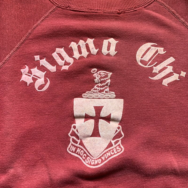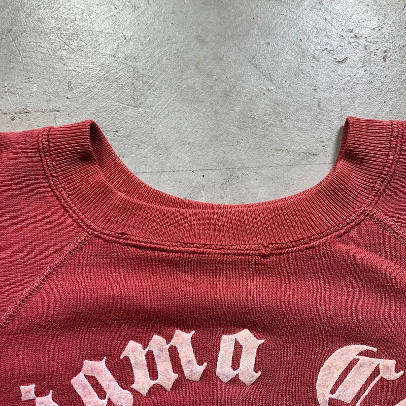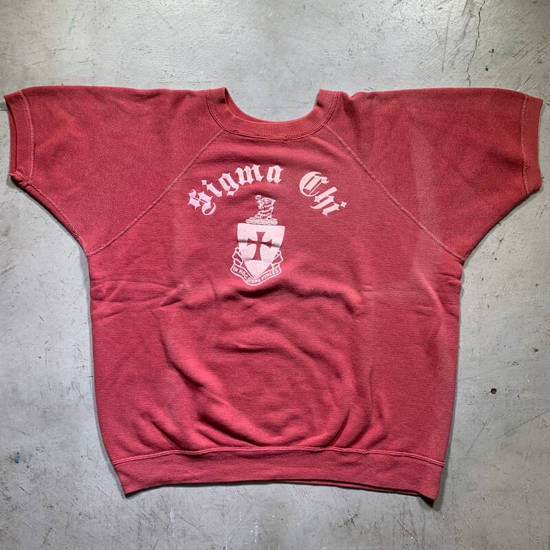 50's 60's UNKOWN 半袖ラグランスウェットシャツ Sigma Chi シグマカイ フロッキープリント フラタニティー エンジ フェード L位 希少 ヴィンテージ BA-1474 RM1843H