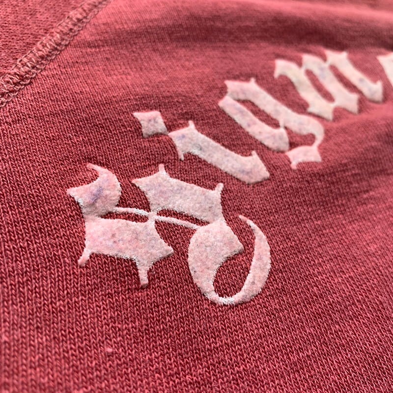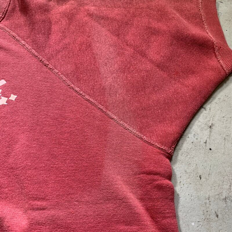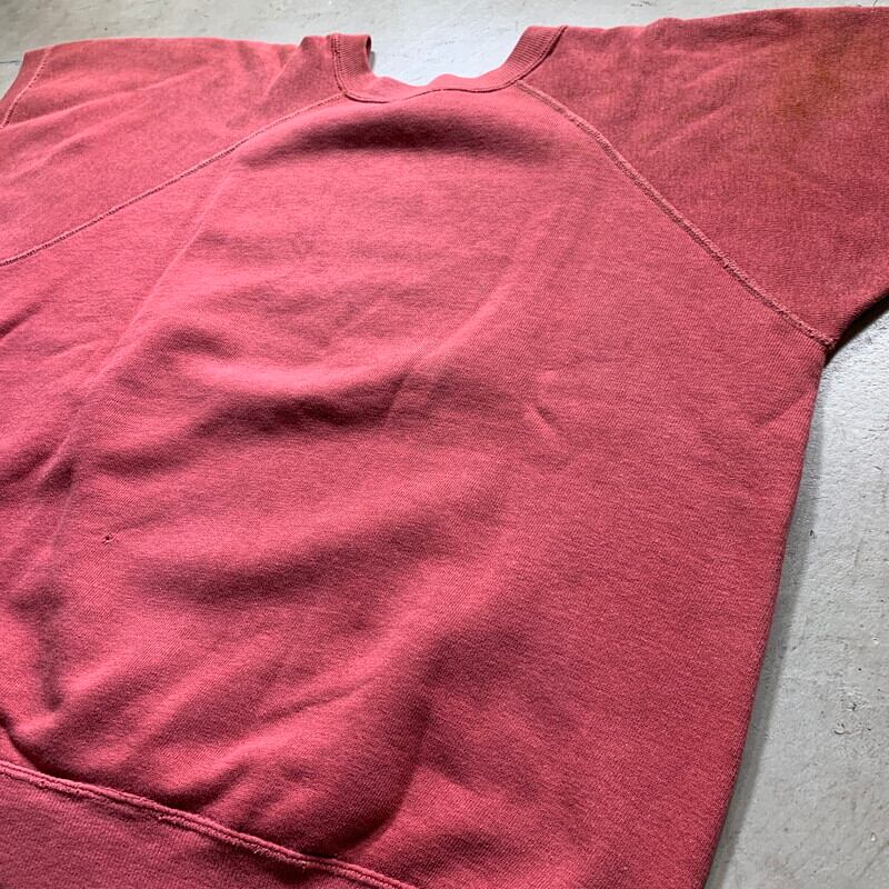 60年代頃のUNKNOWNラグランスウェットです。1855年にマイアミ州オハイオ大学で設立されたSigma Chiというフラタニティーのフロッキープリントがフロントに入ります。襟元と裾は2本針、その他がフラットシーマで縫製されています。ヴィンテージスウェットの定番カラーといえるエンジ色で全体に程よく褪色しており、一部サンフェードで色が薄くなっている箇所もございます。背面に小穴が1箇所ございます。右肩後に錆のような汚れがございます。ヴィンテージスウェットでは珍しいビッグサイズで、身幅もしっかりとございます。ゆったりサイズでお探しだった方は是非いかがでしょうか。