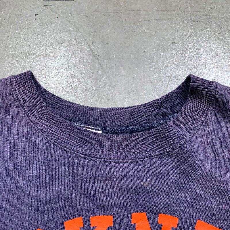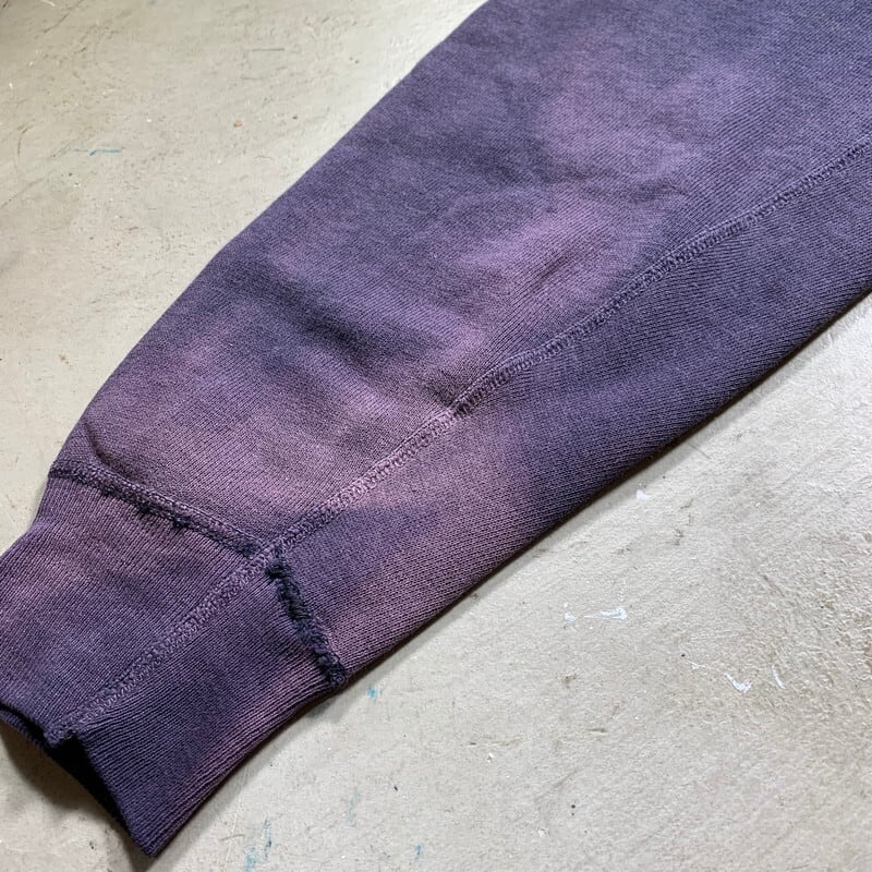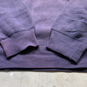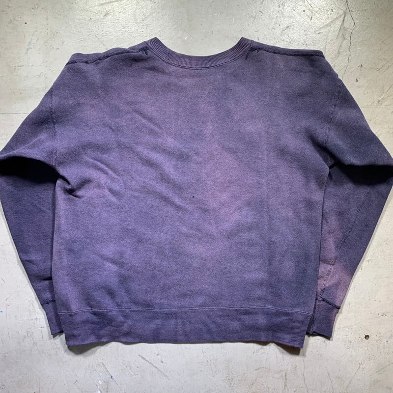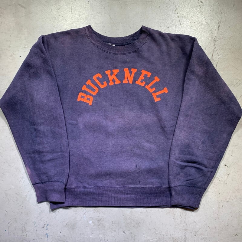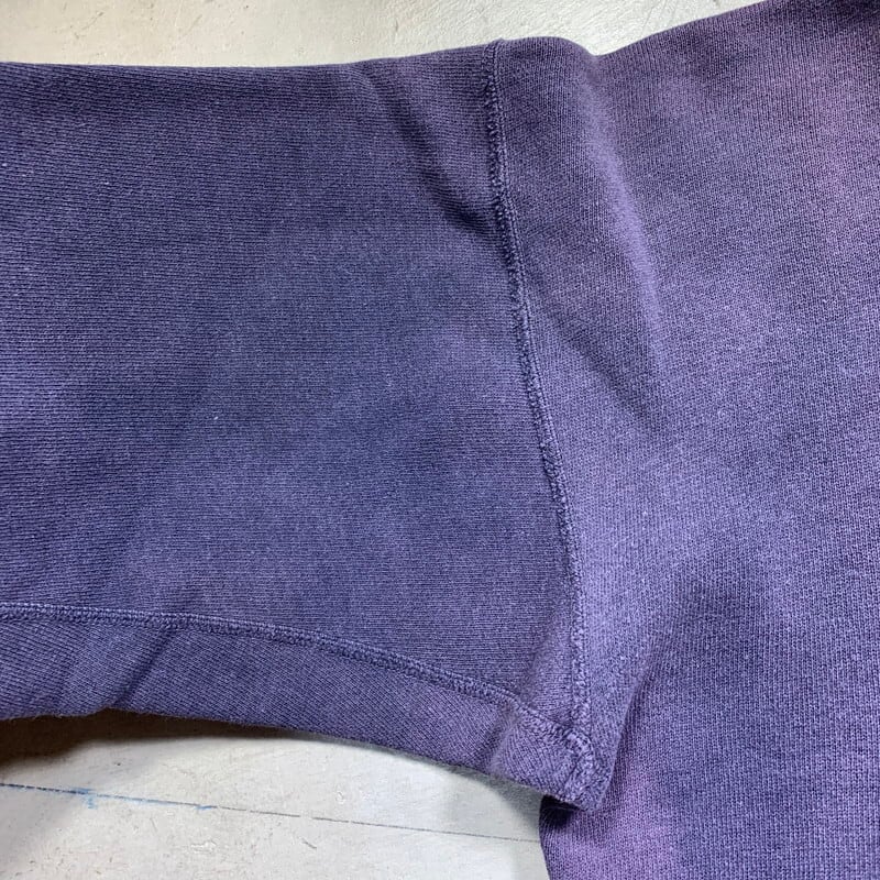 60年代頃のChampionセットインスリーブスウェットです。インCと呼ばれるランタグが付きます。フロントにはBUCKNELL大学のラバープリントが入ります。襟元2本針、その他は4本針のフラットシーマで縫製されています。元々は濃いネイビーカラーが経年によるヤケで、見事なナス紺カラーへと変貌しています。オレンジのプリントとの相性は100点満点です。稀に見るバランスよいサンフェードで、濃淡の付き方が非常に素晴らしい1着です。ボディに小穴がいくつかございます。ステッチ飛びがあったであろう箇所は丁寧にハンドリペアが施されています。MEDIUM表記で着丈はやや短めですが、敢えて短丈で合わせてみてはいかがでしょうか。パープル×オレンジのゴールデンコンビなカラーのヴィンテージスウェットはお探しの方も多いと思います。是非この機会にコレクションに加えてみてはいかがでしょうか。